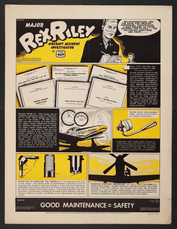 Major Rex Riley Training Poster (1951 Technical Inspection & Flight Safety Research). Korean War era USAF training poster with art by Msgt. Steve Hotch. 16" x 21", single sheet, color. Multiple full length creases with light chewing to bottom edge and a sticker shadow in upper margin.