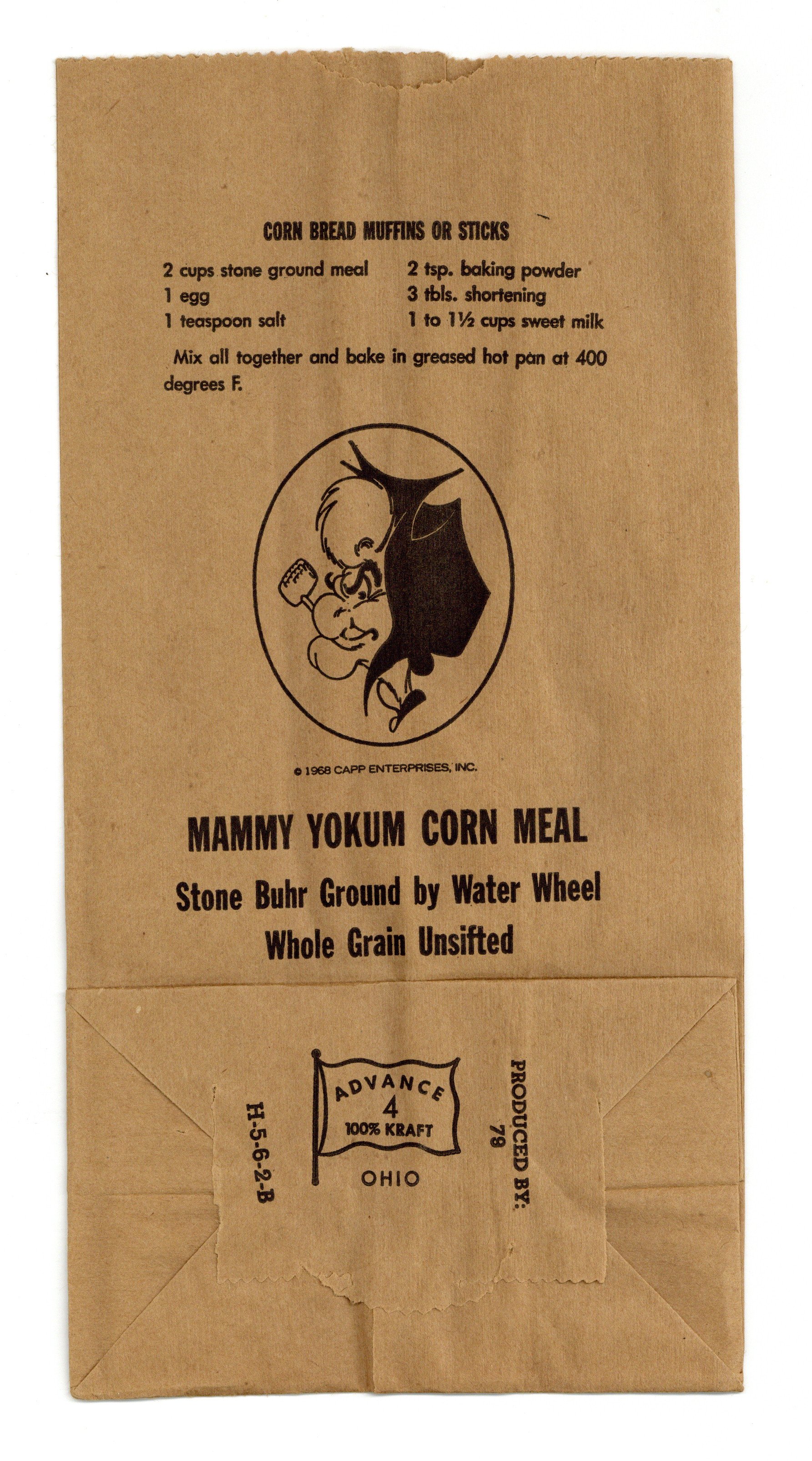 Mammy Yokum Corn Meal Bag (1968 Capp Enterprises, Inc.). One craft paper bag, crisp and unused. 5" x 10", original flat folding.