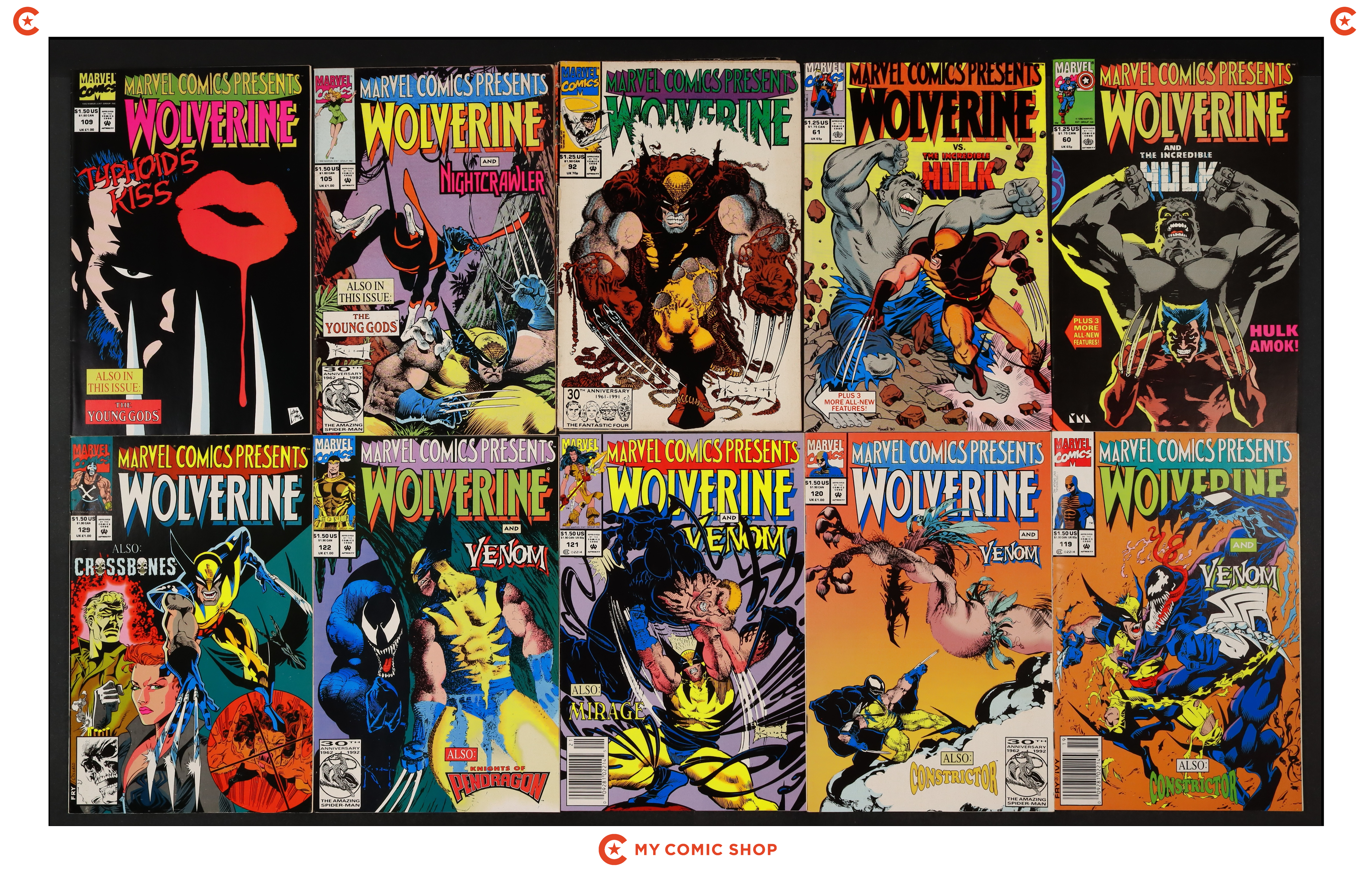 Issues 60, 61, 92, 105, 109, 119-122, and 129 of Marvel Comics Presents (1988). Most will grade in the FN/VF to FN range with a couple grading VG.