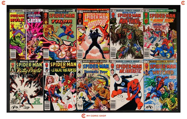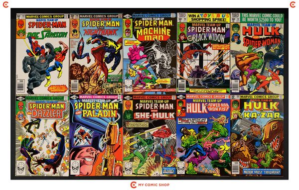 Issues 52, 54-58, 60, 62, 63 of Marvel Team-Up (1972 1st Series) and issue 61 of Marvel Team-Up (1972 1st Series) Whitman Variants. Most will grade in the GD to VG range with #58 Grading FR and #63 grading FN.