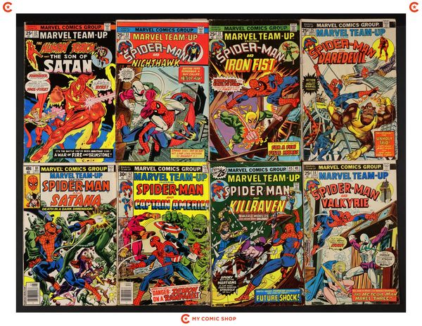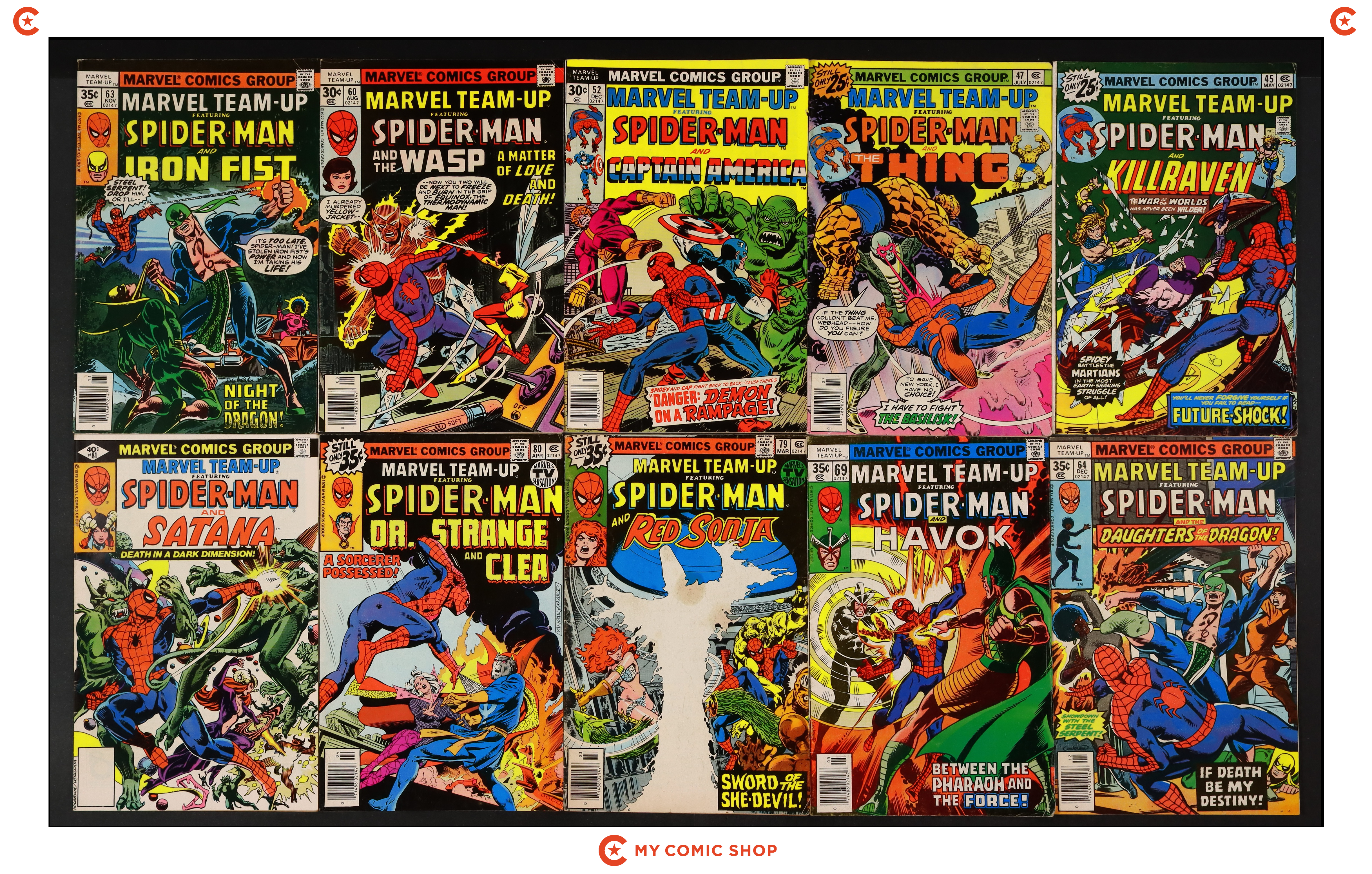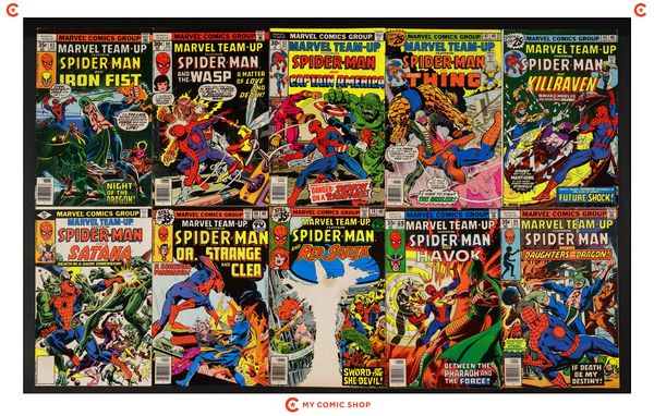 Issues 45, 47, 52, 60, 63, 64, 69, 79-81 of Marvel Team-Up (1972 1st Series). Most will grade in the VG to FN range with #79 grading GD.