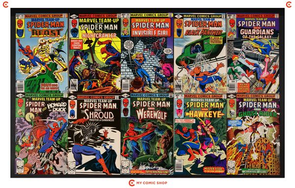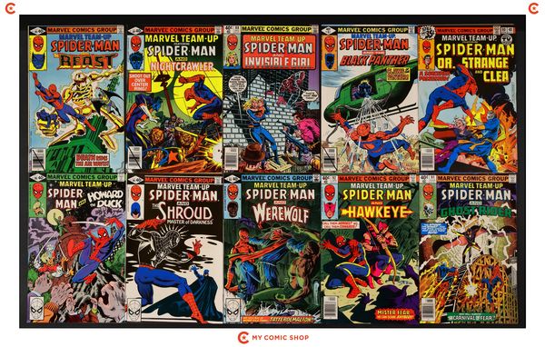 Issues 97N, 98, 99, 101MJ, 102N, 104, 105, 107, 108D, and 109D of Marvel Team-Up (1972 1st Series). Most will grade in the FN range with some grading VF.