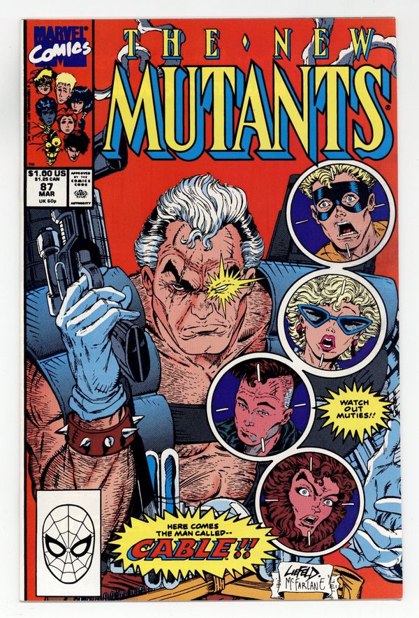 Starts Jan 19 First printing. Direct Edition. 1st full appearance of Cable. Liefeld art. Liefeld/McFarlane. Cover pencils by Rob Liefeld, inks by Todd McFarlane. A Show of Power!, script by Louise Simonson, pencils by Rob Liefeld, inks by Bob Wiacek; The Mutant Liberation Front attacks more research stations; Mystique threatens Skids; a federal agent shoots Rusty; he and Skids allow the MLF to rescue them; the New Mutants return to New York; after trying to stop the MLF, Cable weighs his options. Part 2 of 4. 36 pages, full color. Cover price $1.00.