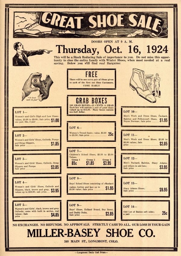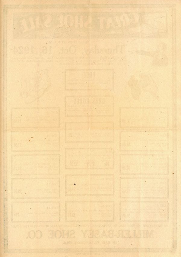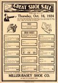 Miller-Basey Shoe Co. Window Sale Sign (1924). 13" x 18", newsprint. Multiple full length creases.