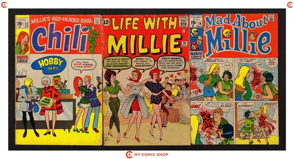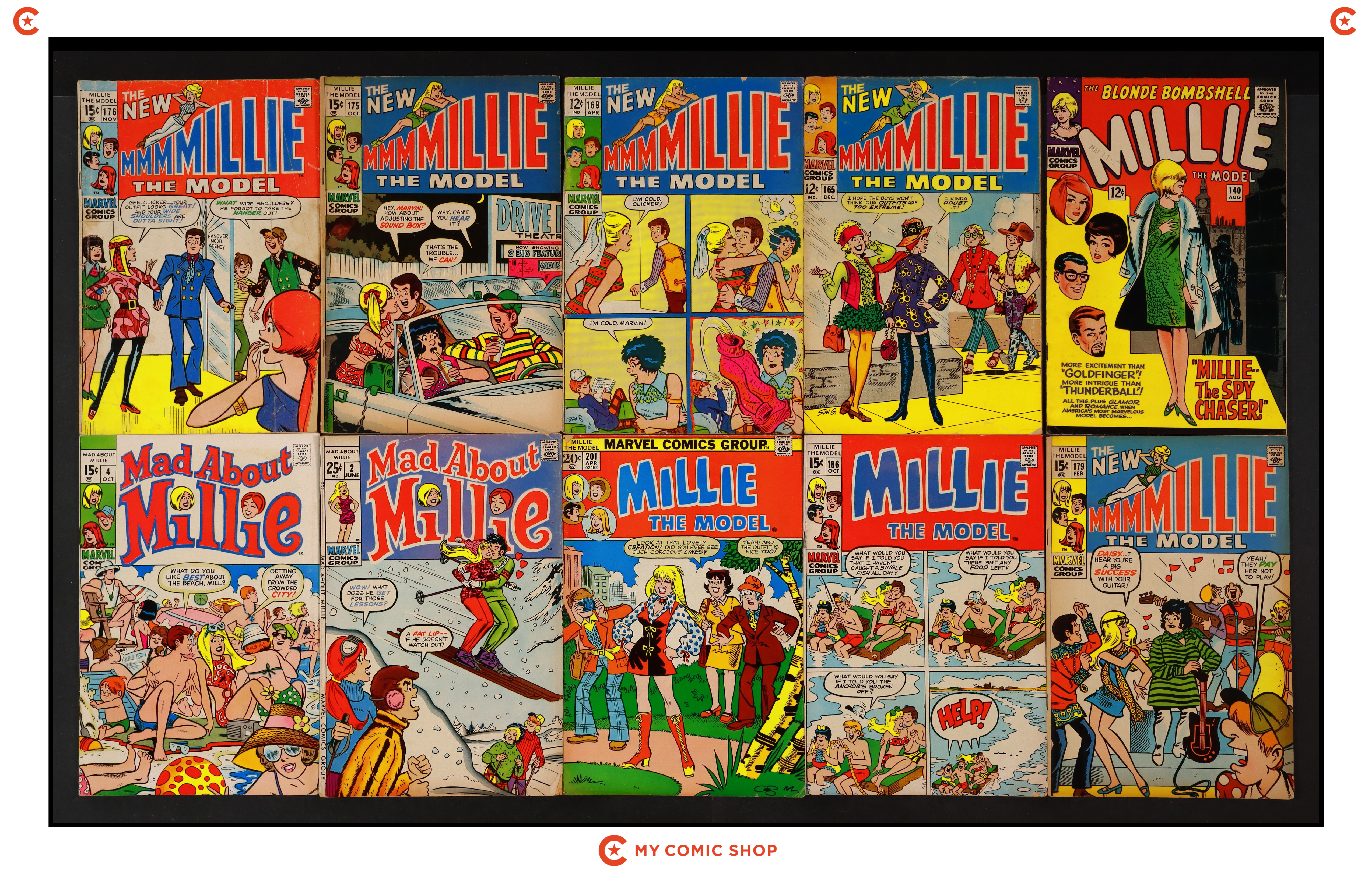 Issues 140, 165, 169, 175, 176, 179, 186, 201 of Millie the Model (1945 Marvel); 2, 4, 16 of Mad About Millie (1969); Life with Millie (1960) 18; and Chili (1969) 12. Most will grade in the FR/GD to VG/FN range.
