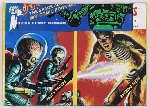 Includes 25 copies each of issues 3 and 4 of the Mars Attacks Mini Comics from 1988 produced by Pocket Comics. 6 1/2" x 2 1/2" x 4 1/2".