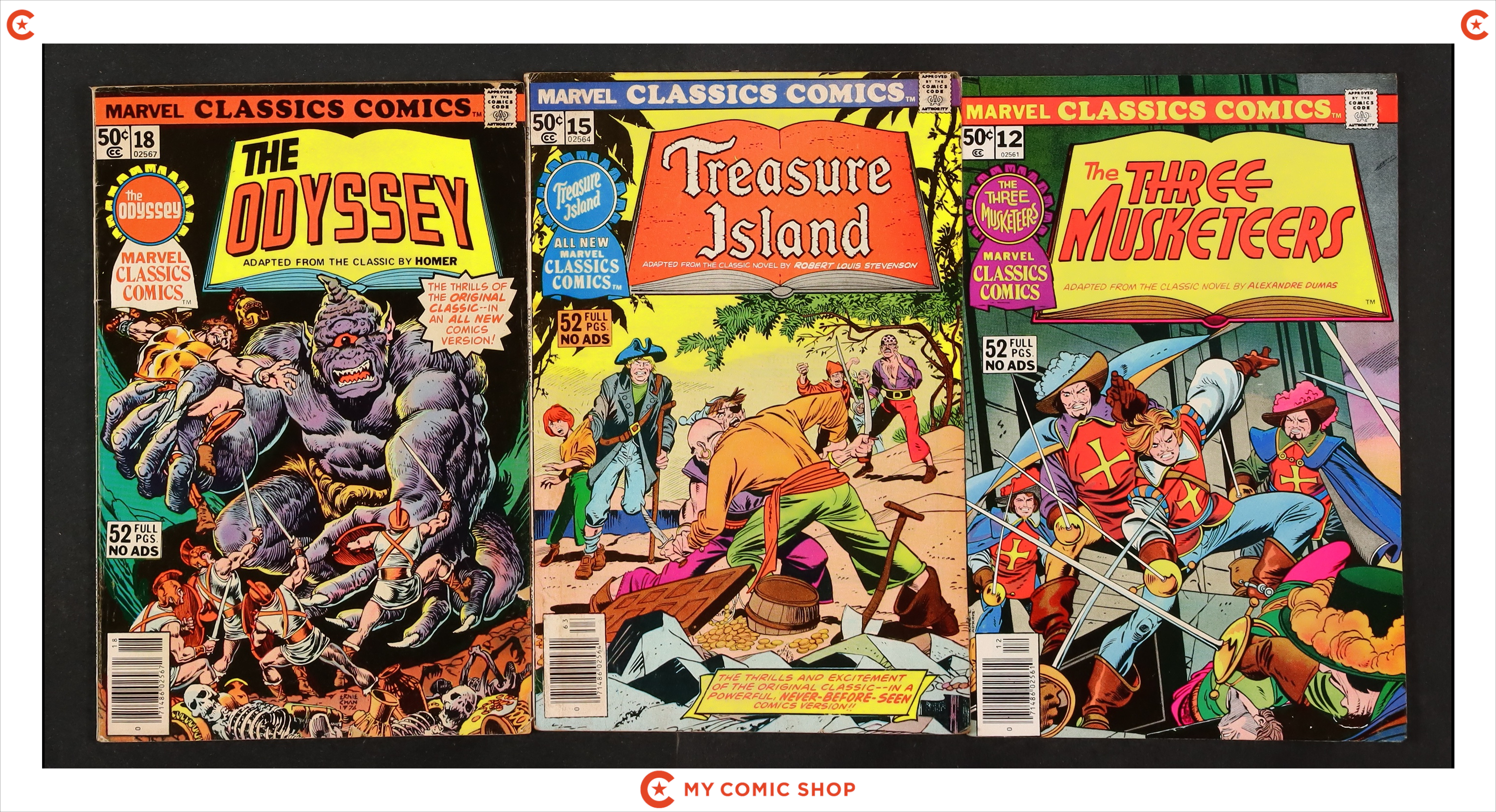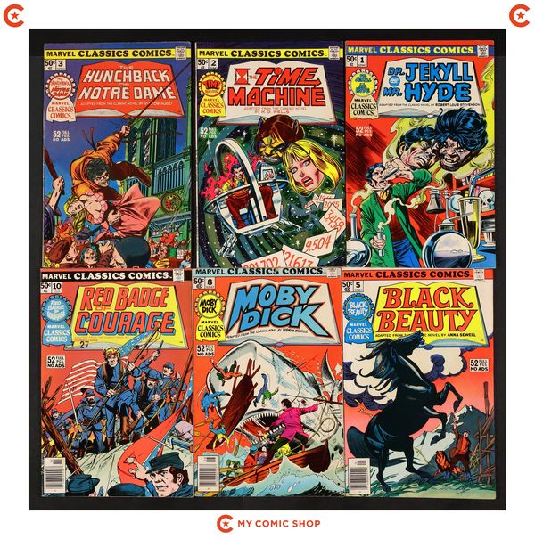Issues 1, 2, 3, 5, 8, 10, 12, 15, and 18 of Marvel Classics Comics Series (1976). Most will grade in the VG to FN range with #15, and #18 grading GD.