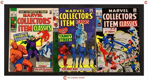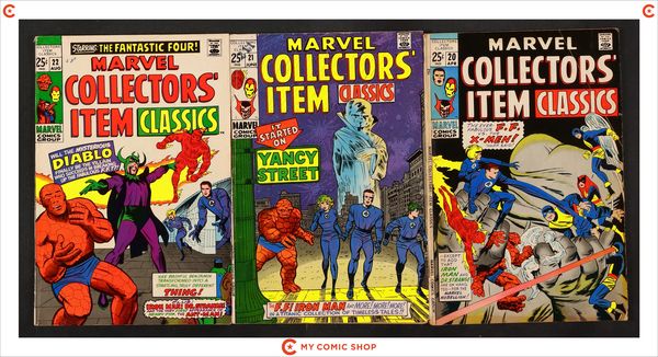 Issues 11-22 of Marvel Collectors Item Classics (1966), and issues 23-25 of Marvel's Greatest Comics (1969). Most will grade in the VG to FN range.