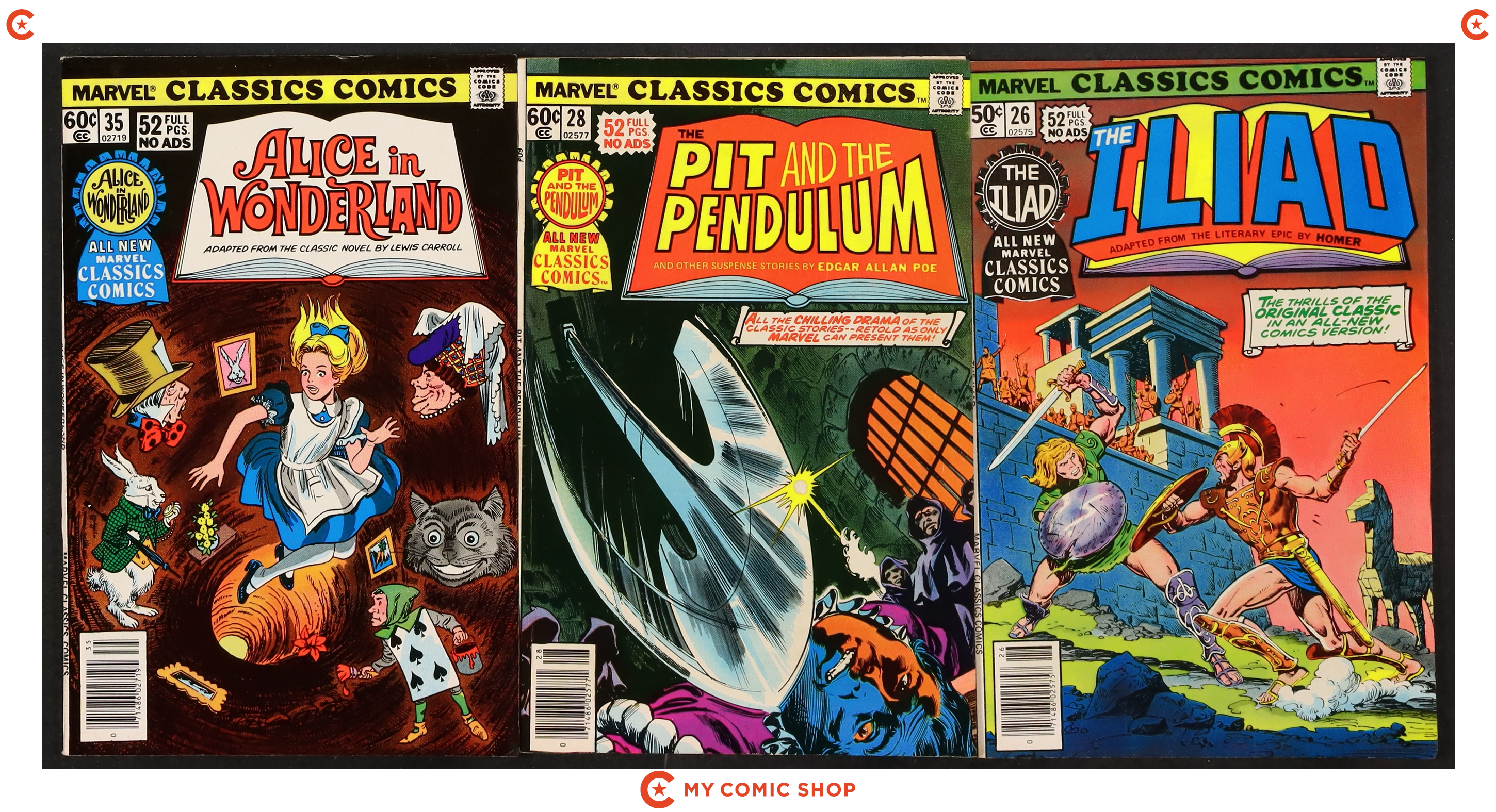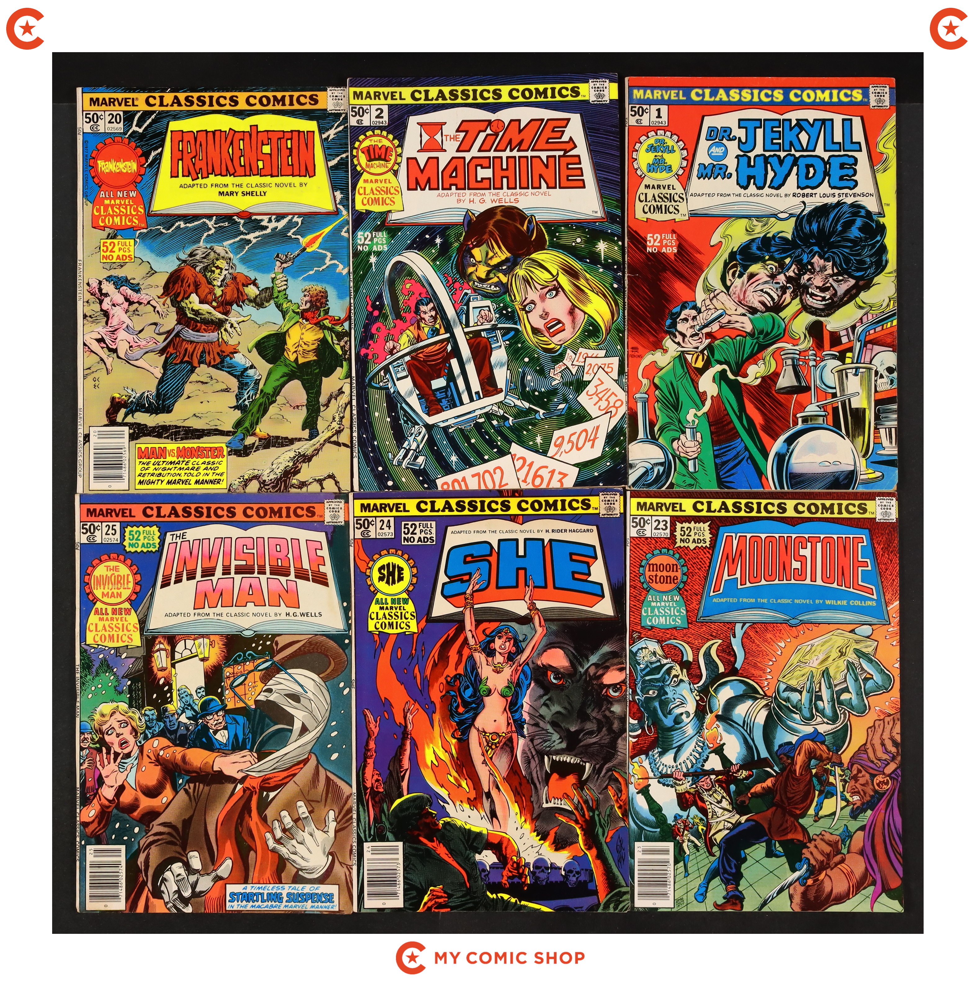 Issues 1, 2, 20, 23, 24, 25, 26, 28, and 35 of Marvel Classics Comics Series (1976). Most will grade in the VG to FN range.