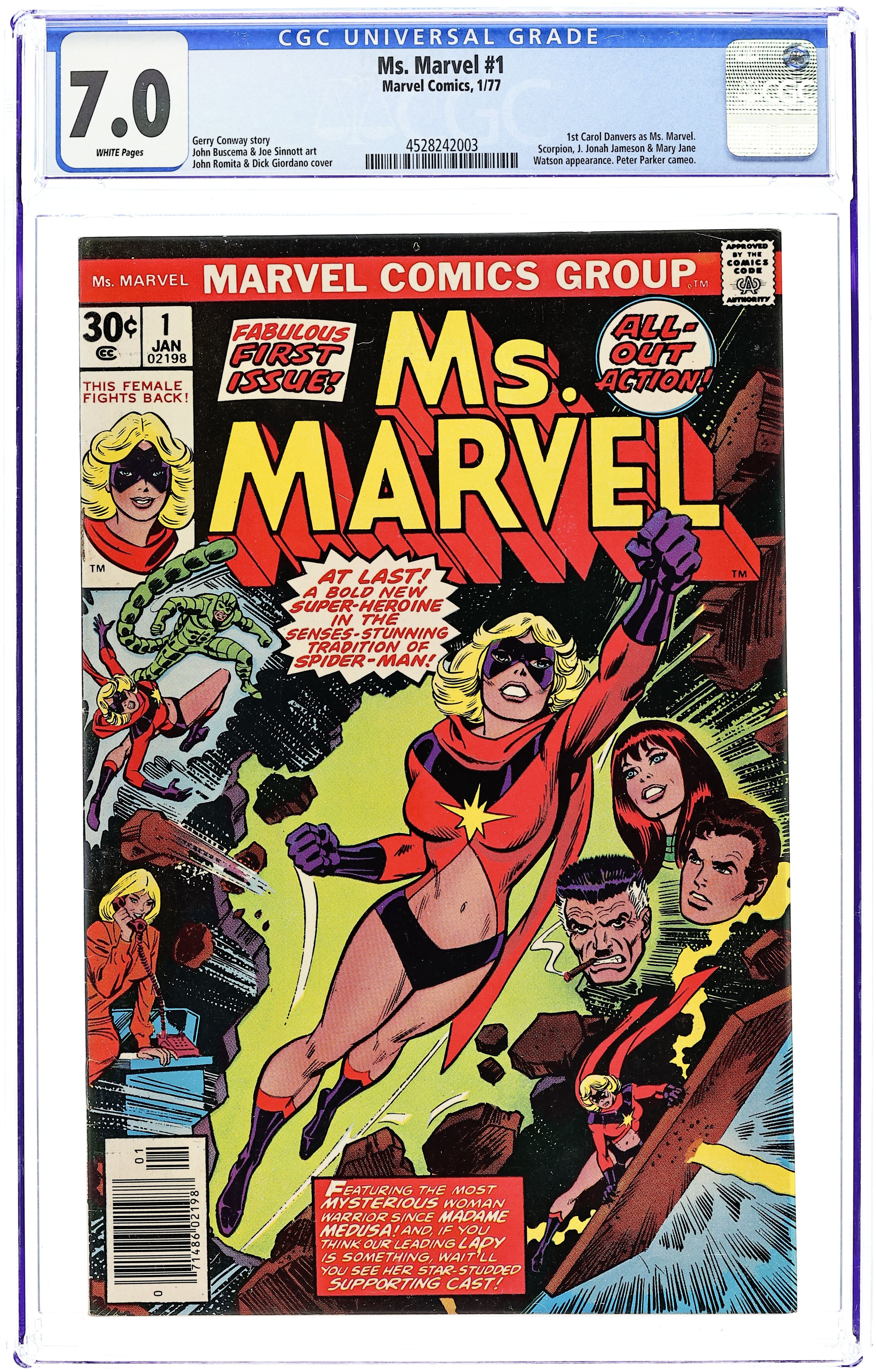 Ends Dec 22 8:58 PM CST Bid History 7 bids Current Bid $11 Your Secret Max Bid If you'd like to bid, please log in or register. John Romita/Dick Giordano cover. John Buscema art. Gerry Conway script. Joe Sinnott/David Hunt inks. Marie Severin colors. "This Woman, This Warrior" Carol Danvers meets Peter Parker, J. Jonah Jameson, Mary Jane Watson, and battles the Scorpion when she gets a job at the Daily Bugle as a fashion editor. Intro Ms. Marvel, Carol Danvers, who last appeared in Captain Marvel # 40. 1st appearance of Ms Marvel. 36 pages, full color. Cover price $0.30.