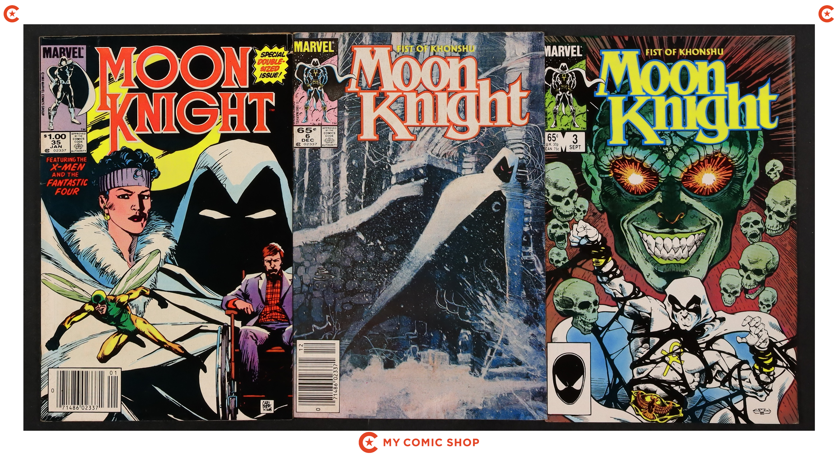 Issues 3, 6 of Moon Knight (1985 2nd Series) Fist of Khonshu, and issue 35 of Moon Knight (1980 1st Series). Most will grade in the VG to FN range.