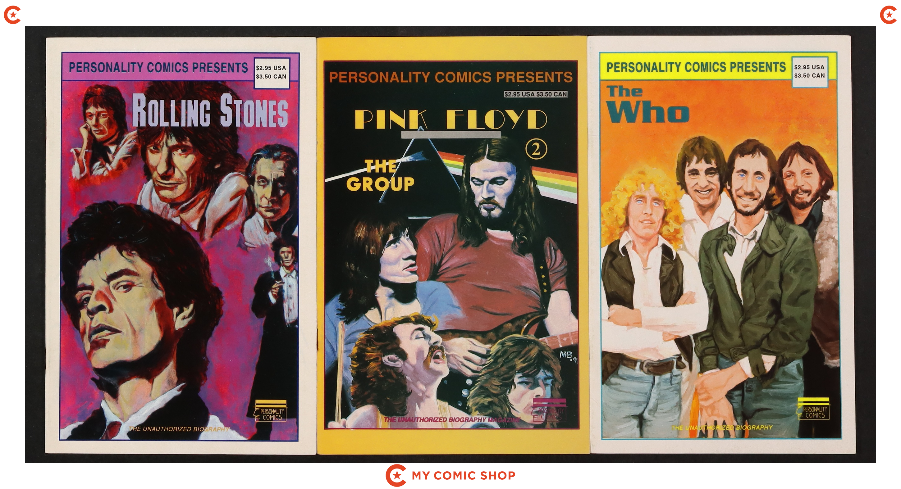 Issue 1 of Personality Comics Presents The Who (1992 Personality Comics), issue 2B of Personality Comics Presents Pink Floyd (1992), and issue 2 of Personality Comics Presents The Rolling Stones (1992). Most will grade in the VG range.