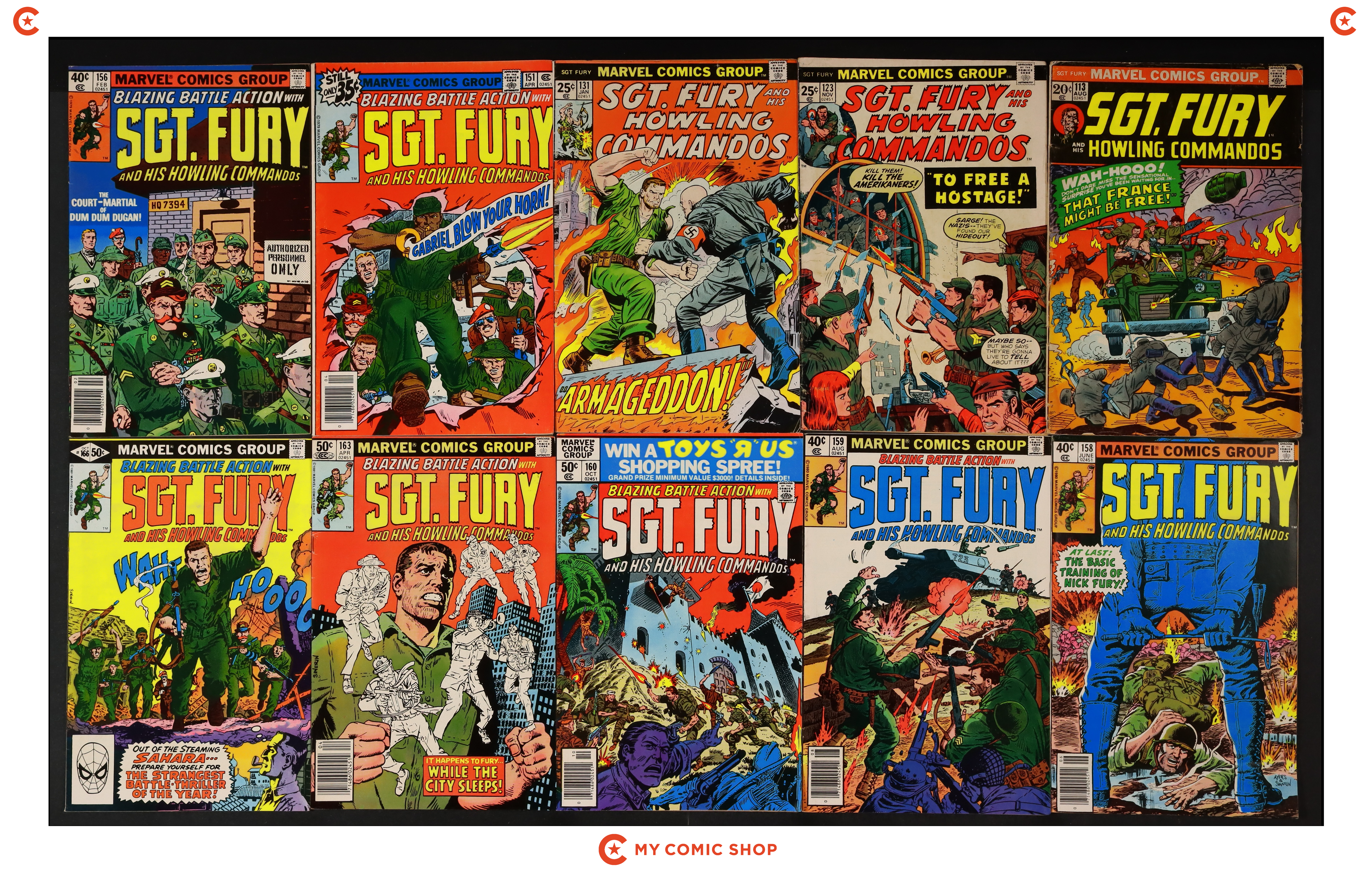 Issues 28, 34, 35, 38, 39, 41, 43, 44, 64 of Sgt. Fury (1963). Most will grade in the VG- to VG/FN range.