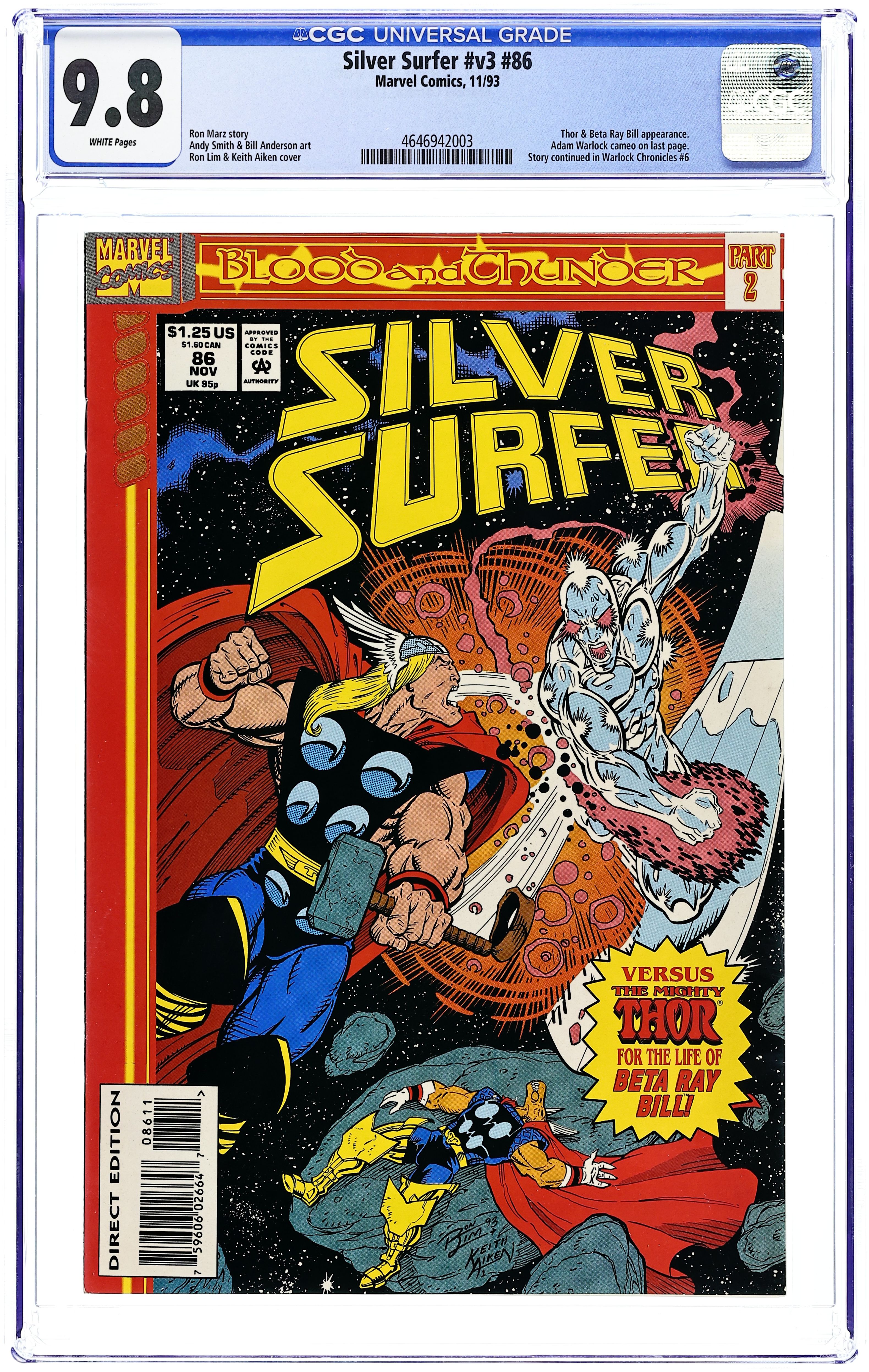 Starts Jan 3 Direct Edition. Blood and Thunder. Part 2 of 13. "Friends and Foes!" Guest-starring Thor and Beta Ray Bill. Adam Warlock cameo. Story by Ron Marz. Art by Andy Smith and Bill Anderson. Cover by Ron Lim and Keith Aiken. Story continued from Thor 468. Seduced by the whispers of the Dark Valkyrie, the Mighty Thor has gone mad. He has beaten his oath-brother Beta Ray Bill almost to death, and now he must face the Silver Surfer and the Power Cosmic. Story continues in Warlock Chronicles #6. 32 pages. Cover price $1.25.