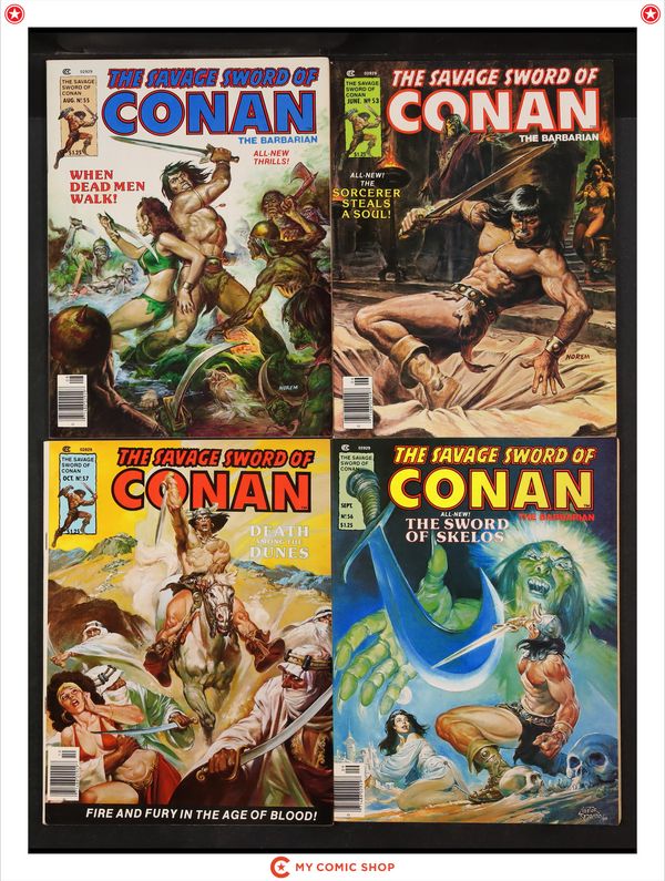 Issues 42, 48-53, and 55-57 of Savage Sword of Conan (1974 Marvel). Most will grade in the FN/VF to FN range.