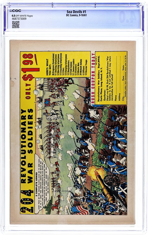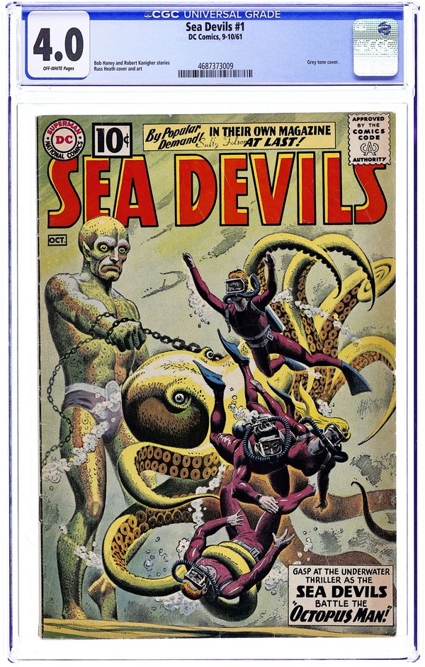 Starts Apr 4 Cover by Russ Heath. "The Sea Devils vs. the Octopus Man!", script by Robert Kanigher, art by Russ Heath; Producer Wendel Wales is shooting a movie about the Sea Devils; His mechanical Octopus Man is destroyed when the real version appears and attacks the movie set. "Secret of the Emerald Whale!", script by Bob Haney, art by Russ Heath; The Sea Devils find an iceberg with the Emerald Whale and Captain Shark frozen inside. 36 pgs., full color. $0.10. Cover price $0.10.