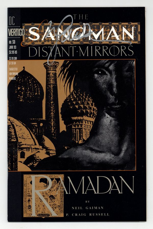 Starts Mar 23 Signed by Neil Gaiman and limited to 5,000 copies. Comes with a limited print of Neil Gaiman drawn by P. Craig Russell and a certificate of authenticity from Limited Treasured Editions. NOTE: May not include the original taped bag and board; all copies we list will have been repackaged after grading. Neil Gaiman script; 52-page giant; Craig Russell art; pin-ups by Dave McKean, Todd McFarlane, and Michael Kaluta; Black cover with Metallic ink Cover price $2.95.
