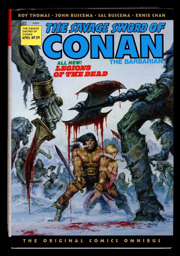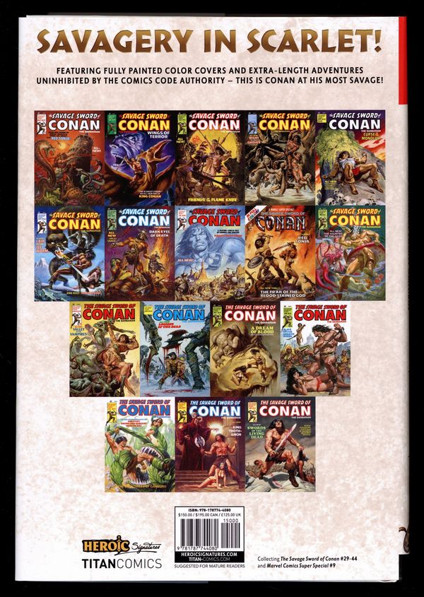 Volume 3 - 1st printing. Collects The Savage Sword of Conan (1974-1995) #29-44 and Marvel Comics Super Special (1977-1986 Magazine) #9. Based on the stories and characters created by Robert E. Howard. Written by Roy Thomas, Christy Marx, Lee N. Falconer, Fred Blosser, Don Thompson, Maggie Thompson, Jim Neal, Doglas Menville, and Robert E. Howard. Art by John Buscema, Bruce Patterson, Dave Wenzel, Carl Potts, Steve Swenston, Ron Wilson, Don Maitz, Dick Giordano, Russ Heath, Ralph Reese, Duffy Vohland, Steve Leialoha, Billy Wray, Al Gordon, Joe Rubinstein, Frank Brunner, Tony DeZuniga, Gene Colan, Pablo Marcos, Carmine Infantino, Alfredo Alcala, Sal Buscema, and Rudy Nebres. Featuring Additional Illustrations By Ernie Chan, Gil Kane, Val Mayerik, Jess Jodloman, Dino Castrillo, John Romita, Sr., Rick Hoberg, Federico Javinal, Anton Caravana, Gary Kwapixz, Kerry Gammill, Tom Yeates, and Marshall Rogers. Cover by Earl Norem. Writer Roy Thomas and Conan artist supreme, John Buscema, are joined by a host of top-tier visual talents-Frank Brunner, Gene Colan, Sal Buscema, Ernie Chan and Carmine Infantino-to tell Conan's most savage tales. This volume's stories range from the young Cimmerian's exploits as a mercenary to his latter days as king of Aquilonia in the iconic "Scarlet Citadel." Anchoring it is Thomas and Buscema's 160-page adaptation of Conan the Buccaneer. It's a high-seas masterpieces that entangles Conan, a vile pirate and a beautiful princess with the forces of Thoth-Amon. Also featuring pinups galore, an exhaustive dictionary of Hyborian era names and places, and the stunningly painted, full-color masterpiece, "The Trail of the Bloodstained God." Hardcover, 8 1/2-in. x 11-in., 1,072 pages, B&W. Mature Readers Cover price $150.00.