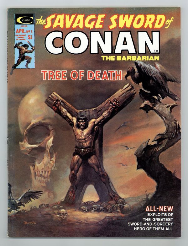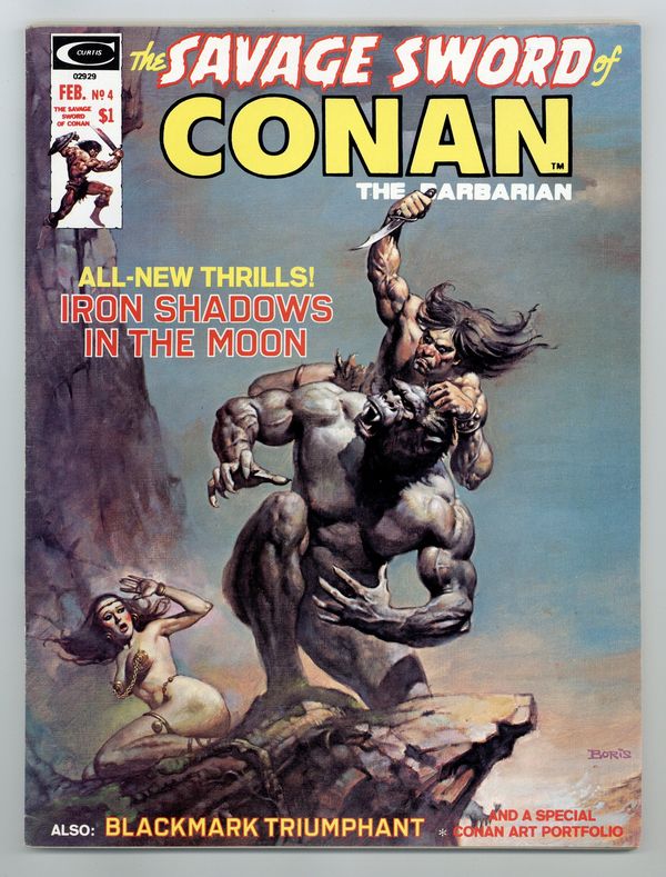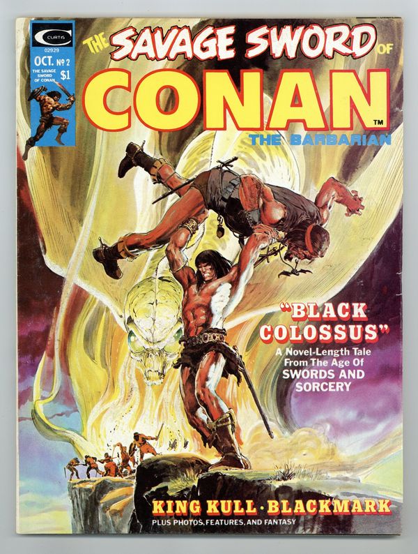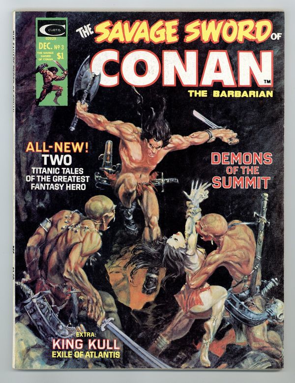 Starts Apr 4 Painted cover art by Boris Vallejo. Conan and Red Sonja star in "Curse of the Undead-Man," script by Roy Thomas, pencils by John Buscema, inks by Pablo Marcos; Conan and Red Sonja put an end to the undead sorcerer Costranno; Adapted from the story "Mistress of Death" by Robert E. Howard and Gerald Page; continued in part from Conan the Barbarian 42. "Red Sonja" (3rd appearance), script by Thomas, art by Esteban Maroto, Neal Adams, and Ernie Chan (as Ernie Chua); When Red Sonja returns with a tiara she was sent for by King Ghannif she learns her "reward" is to be made a part of his harem. "Blackmark," script and art by Gil Kane (reprinting chapter 1 from the Bantam Books paperback); a Conan reprint from Savage Tales 1 (plus the additional splash page from Conan the Barbarian 16). "The Frost Giant's Daughter," script by Thomas, art by Barry Windsor-Smith (adapted from the Howard story); Conan chases Atali across the snow, slays her two frost giant brothers, and catches her; Her father, Ymir then takes her from Conan. "Conan's Women Warriors," an article by Fred Blosser illustrated by Esteban Maroto, Steve Gan, Hugh Rankin (original Weird Tales art), and Roy Krenkel; and "An Atlantean in Aquilonia," a Kull article by Glenn Lord illustrated by John Severin and Ross Andru. Alfredo Alcala pin-up. Maroto frontispiece. 84 pgs., B&W. Cover price $1.00.