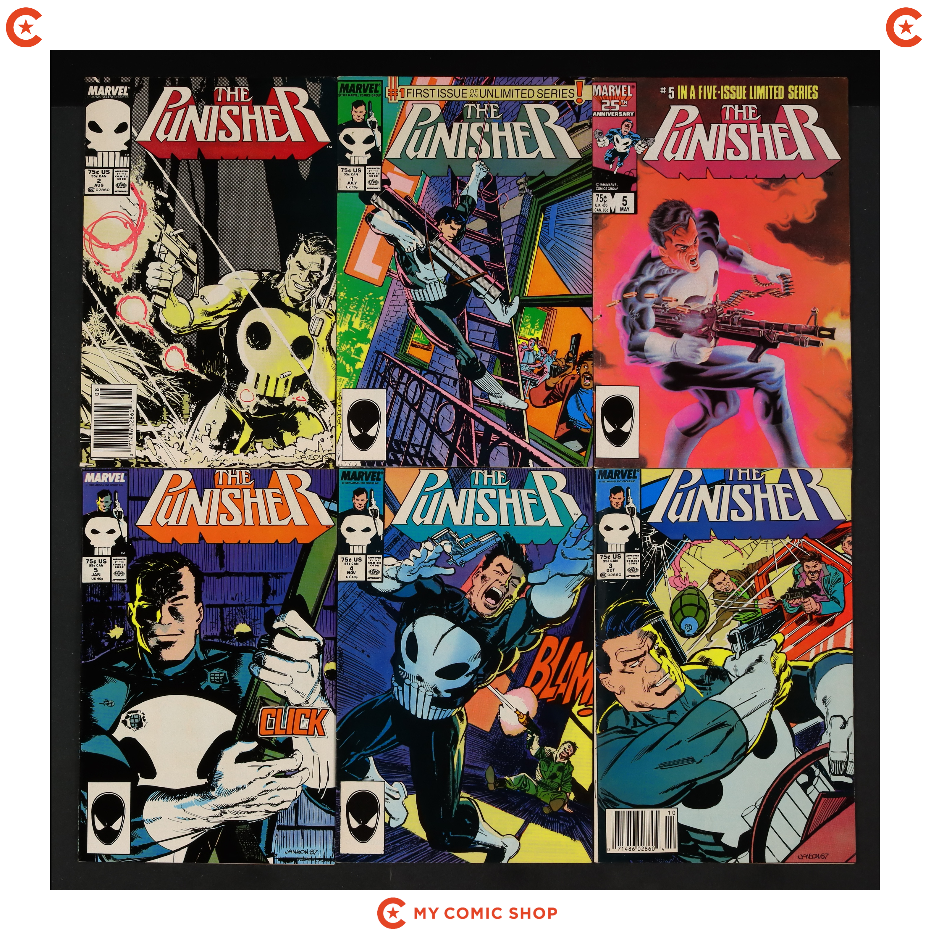 Issues 5D of Punisher (1986 1st Series); and 1D and 2-8 of Punisher (1987 2nd Series). Most will grade in the FN range with #2 grading VG.