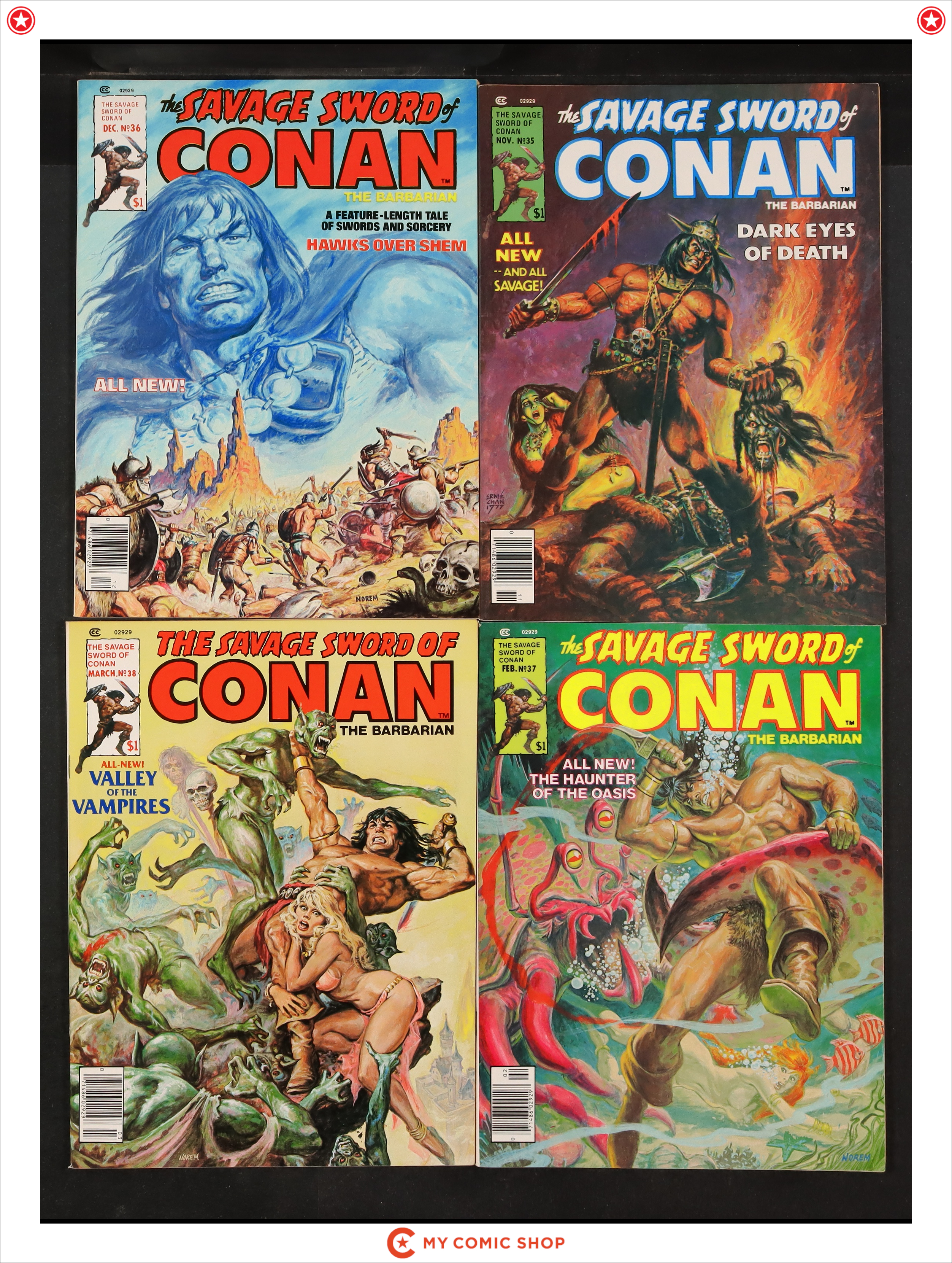 Issues 27, 28, 30, and 32-38 of Savage Sword of Conan (1974 Marvel). Most will grade in the FN range with a few grading VF.