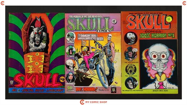 Issues 1 3rd printing, 2 7th printing, 4 1st printing of Skull Comics (1970 Rip Off Press/Last Gasp). Most will grade in the VG to FN range.