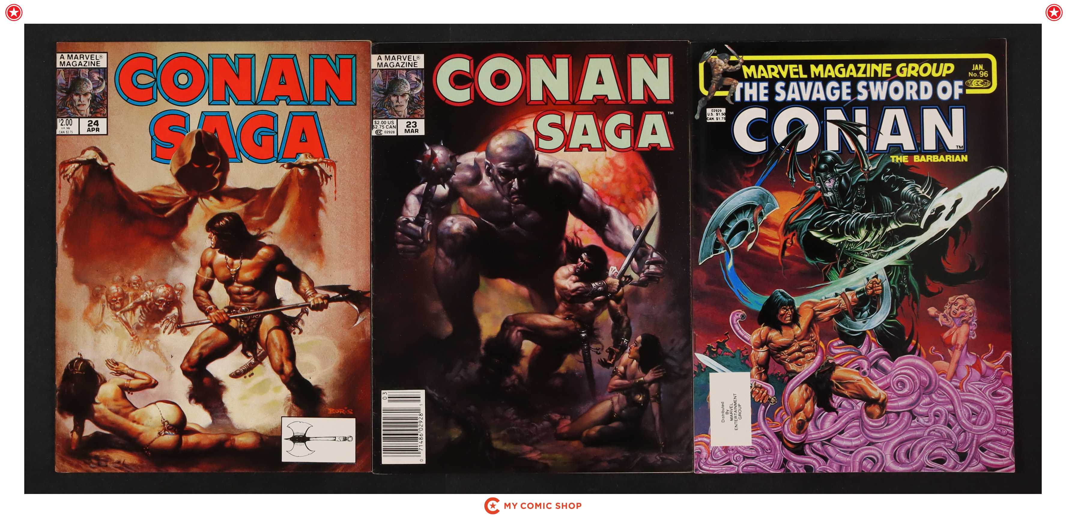 Issues 5, 9, 10, 83, and 96 of Savage Sword of Conan (1974 Marvel); and 23 and 24 of Conan Saga (1987). Issues 5, 9, and 10 will grade GD to FR and the remaining issues will grade VF to FN.