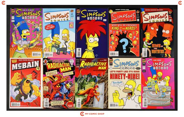 Issues 71, 73, 77, 87D, 95, 98, 99 of Simpsons Comics (1993 Bongo); 106, 197 of Radioactive Man (2000 2nd Series); and McBain (2014) 1. Most will grade in the VF to VF/NM range.