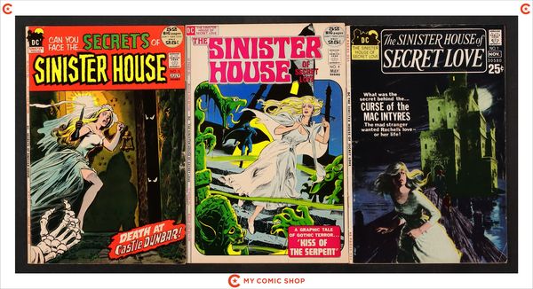 Issues 1, 4 of Sinister House of Secret Love (1971) and issue 5 of Secrets of Sinister House (1972). Most will grade in the VG to GD/VG range.