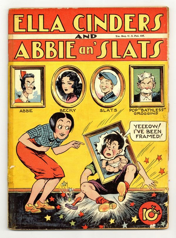 Ends Mar 23 9:23 PM CST Bid History 6 bids Current Bid $32 Your Secret Max Bid If you'd like to bid, please log in or register. Cover by Raeburn Van Buren. Stories and art by Raeburn Van Buren, Charlie Plumb and Bill Conselman. United's anthology series presented a different comic strip in every issue. This issue focuses on two: Depression-era rags-to-riches hero Ella Cinders, and comedy-drama Abbie an' Slats. Ella's brother Blackie takes a tour of the museum with his friends, but their reenactments of the sculptures aren't appreciated by the other patrons. Blackie has a close encounter with an escaped lion at the circus. Abbie an' Slats features Slats, his small-town sweetheart Becky, and Becky's reprobate father "Bathless Groggins," with exceptionally nice art by Raeburn Van Buren. Wealthy Cissy decides to have Bathless and Becky run out of town so she can have Slats to herself. Ella Cinders; Chris Crusty; Abbie an' Slats. Final issue of the series. 64 pages, Full Color. Cover price $0.10.
