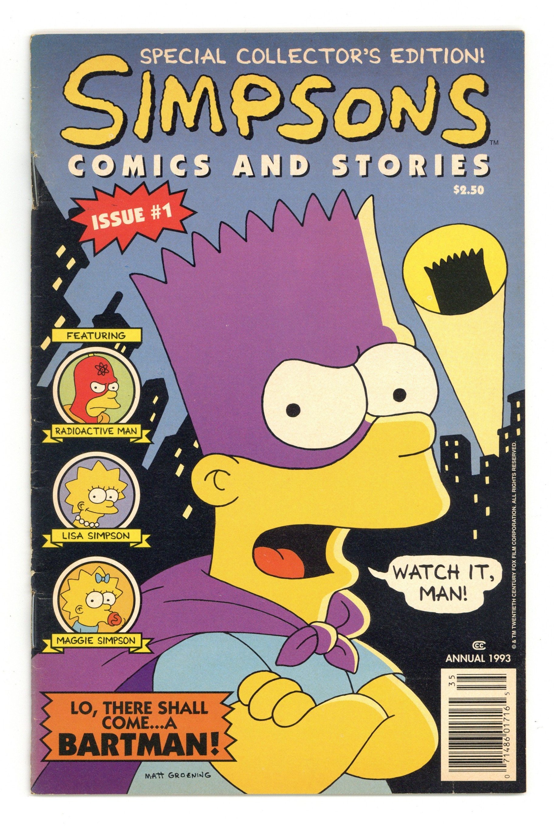 Starts Apr 20 Simpsons Comics and Stories Butterfinger Mini Comic Edition (1993) is a giveaway (despite the $2.50 cover price) variant of the full-size comic, with all the stories and ads that appear in the regular edition. The cool thing about this small-sized No. 1 is that it was found only in packages of Butterfinger candy bars. That's why it's so small. It may have come out BEFORE the actual No. 1 issue hit the stands, which would make this mini comic edition the first appearance of the Simpsons. As with the full-sized edition, stories include "Lo, There Shall Come a Bartman" (co-plot by Cindy Vance, script, layouts, and inks by Steve Vance, inks by Bill Morrison and Mike Anderson), "Bring Me the Head of El Barto" (script and art by Morrison), and "Maggie's Excellent Adventure" (co-story and layouts by Steve Vance, co-story by Cindy Vance, finished art by Ray Supreme). Cover price $2.50.