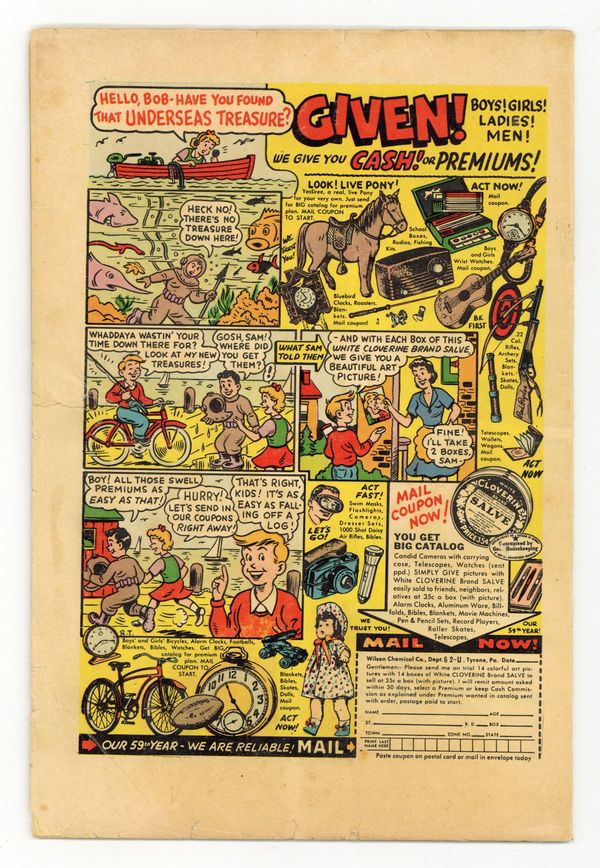 Starts Apr 4 Painted cover art by Allen Anderson. Ad for Jim Prentice Electric Football. Victory on Valda, art by Murphy Anderson; Captain Crockett's troops have a hard time convincing the freedom fighters of the planetoid Valda that they're not just as bad as the Belzarians, until nurse Wing saves Menso's daughter Rada. Every Space Buster a One-Man Army; Everything you want to know about their metallo-plastic helmets, thermo rifle, proton pistol, micro-grenades, and Space Buster Academy outside Luna City on the Moon. Remember Makano, art by Murphy Anderson; After the traitor Senstral leads an attack of the Utani ape-men on the outpost on Makano, Captain Crockett leads a select platoon that decimates the Utani barracks and destroys the Belzarian death ray tank corps. The True Story of Flying Saucers text story by Harry Harrison. Life in the Solar System, art by Everett Raymond Kinstler; Mercury is too hot, Jupiter is too cold, but they hold out the possibility of life on Venus and Mars. Mission to Baldor!, art by Marvin Stein; Capt. Crockett befriends Sabra, the leader of the guerilla movement on the planetoid Baldor. The Batmen of Luna, art by John Prentice. 36 pgs. $0.10. Cover price $0.10.