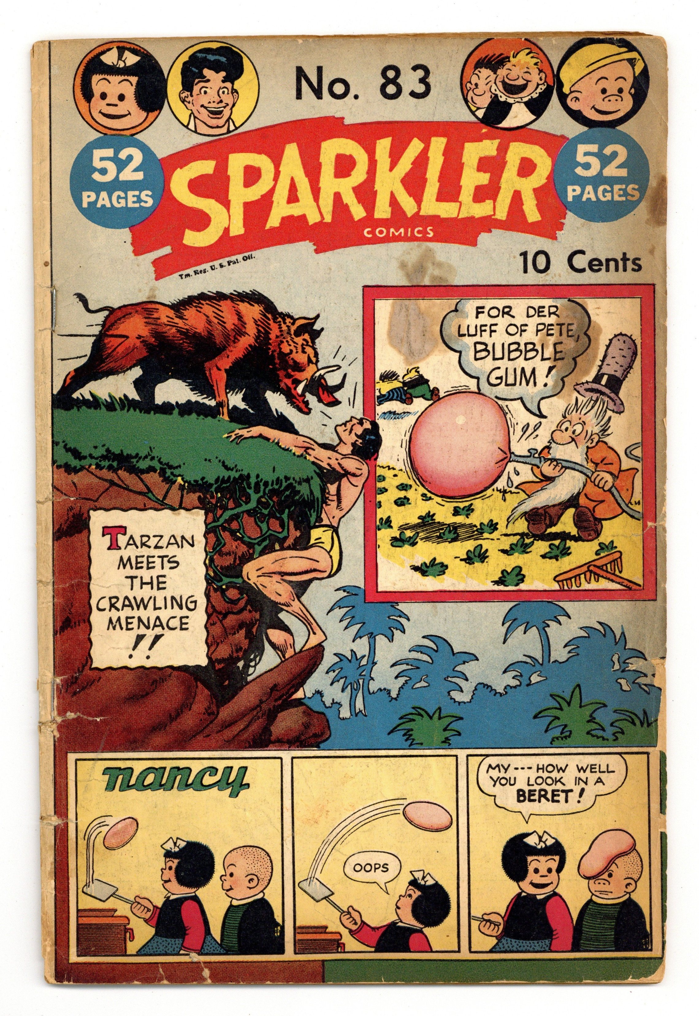 Ends Mar 23 9:24 PM CST Bid History 2 bids Current Bid $2 Your Secret Max Bid If you'd like to bid, please log in or register. Stories and art by Burne Hogarth, Paul Berdanier, Fred Methot, Bernard Dibble, Ernie Bushmiller, Jack Sparling, Drew Pearson, Bob Allen, Milburn Rosser, Rudolph Dirks, Charlie Plumb, Bill Conselman, Harry O'Neill, Raeburn Van Buren and Abner Dean. United's anthology featured reprints of early comic strips plus an original hero, The Spark Man, who joined the military to fight in WWII. Having sabotaged the anti-aircraft batteries of the Stuttgart dam, The Spark Man is captured by Nazis and taken to a torture dungeon in an old castle. In a strip that plays on comic-strip politics of the time, Bathless Groggins is dismayed that cartoonist Cal App is partying with the rich and famous, while relying on an anonymous assistant to do his strip. Back from the round-the-world trip, the Captain and Mama want to put the Kids in school, but the Kids waste no time resuming the business of mischief. Plus a Tarzan adventure by Burne Hogarth. Spark Man; Hap Hopper; Nancy; Captain and the Kids; Ella Cinders; Tarzan; Abbie an Slats; Broncho Bill; Race Riley and the Commandos; Sparkler Salutes; El Bombo; Funny Side Up. 56 pages, Full Color. Cover price $0.10.