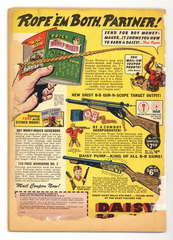 Starts Jan 3 Cover art by Al Plastino. The Two Identities of Superman, pencils by Wayne Boring, inks by Stan Kaye; Superman tries to convince Hollis Shore that he's really Perry White. The Men Who Had to Guard Superman, script by Bill Finger, pencils by Wayne Boring, inks by Stan Kaye; When a dying scientist tells Clark a secret formula, the Secret Service decides they must protect him. Smokey, the Fire-Preventing Bear Comes to the Rescue of Peter Porkchops public service announcement, script by Jack Schiff, art by Otto Feuer. Casey the Cop humor two-pager by Henry Boltinoff. Birth of the Leathernecks, an origin of the U.S. Marines. Superman Fights the Super-Brain, pencils by Wayne Boring, inks by Stan Kaye; The Toyman builds a super computer to plot crimes for him. Stan Musial Wheaties full-page ad. 52 Pages, Full Color. Cover price $0.10.
