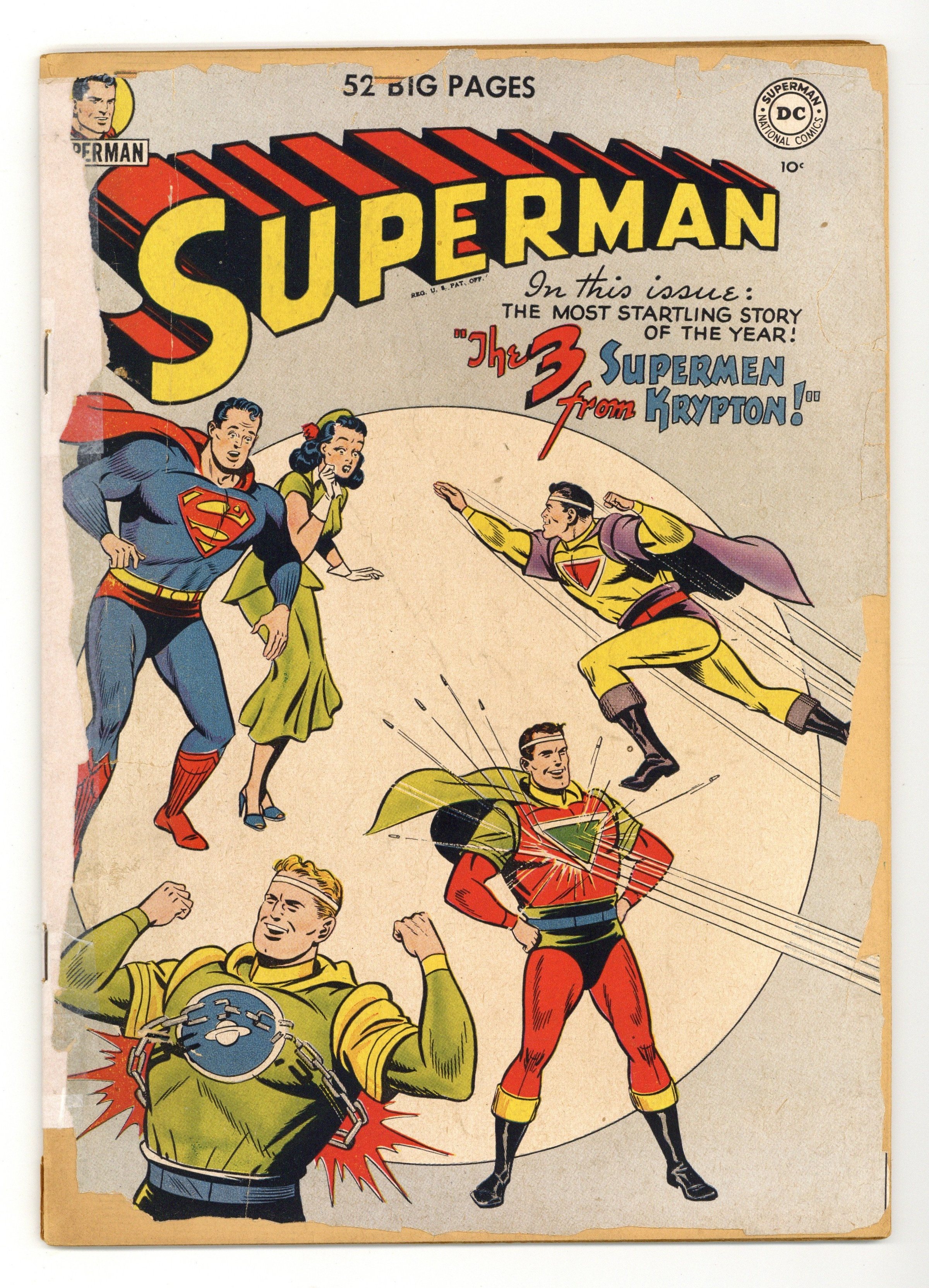 Starts Jan 19 Cover art by Al Plastino. The Testing of Superman, pencils by Wayne Boring, inks by Stan Kaye; As a reward for saving Lois's life, Superman lets Dr. Potts perform a complete set of scientific tests on his powers. Superman's Sweetheart, script by William Woolfolk, pencils by Al Plastino, inks by Stan Kaye; Lois gets jealous when Superman seems to be paying more attention to Peggy, her roommate. Balance Your Fun Diet public service announcement starring Buzzy, script by Jack Schiff, art by Win Mortimer. Shorty humor page by Henry Boltinoff. Three Supermen from Krypton!, script by William Woolfolk, art by Al Plastino; Superman meets three Kryptonian brothers who were convicted and sentenced by Krypton's Ruling Council to a sentence of suspended animation adrift in space; The first appearance of other survivors of Krypton. Peg humor page by Henry Boltinoff. 52 Pages, Full Color. Cover price $0.10.