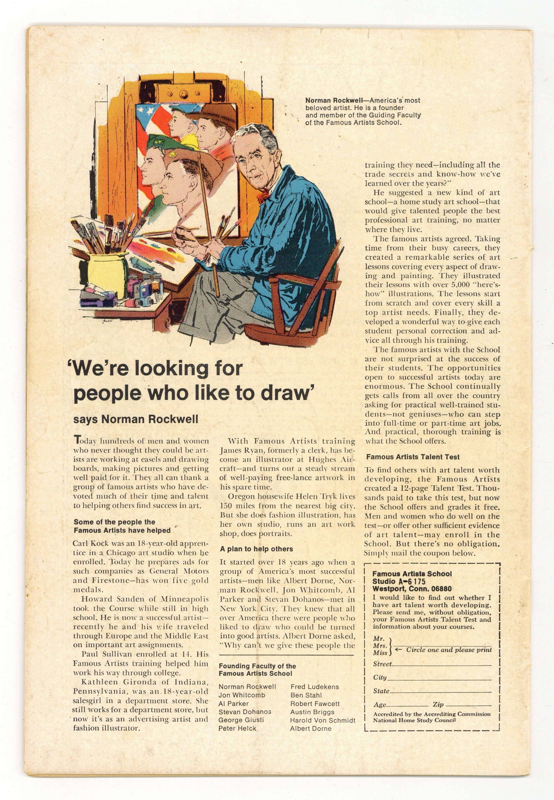Starts Jan 19 Cover art by Russ Heath. Last Dive of the Sea Devils!, art by Russ Heath; As the radio reports a UFO sighting, the Sea Devils, out in the boat Sea Witch, meet a giant "King Neptune" spearing boats from a giant sea horse. Ad for Justice League of America. Frogmen(?) of Olde!; Historical piece about Alexander the Great's use of "combat divers." Undersea Scavenger Hunt!, script by Robert Kanigher, art by Russ Heath; Having lost their boat, the Sea Witch, the Sea Devils enter a millionaire-sponsored underwater scavenger hunt to win a new boat; They find a life ring from the Marie Celeste, a jeweled sword, and other treasures, but lose them through mishaps. Ad for Our Army at War. 36 Pages, Full Color. Cover price $0.10.