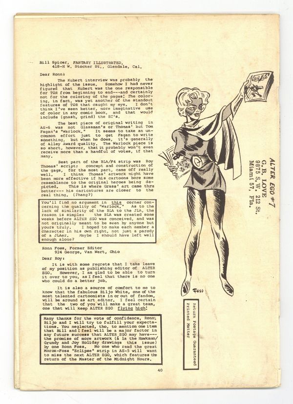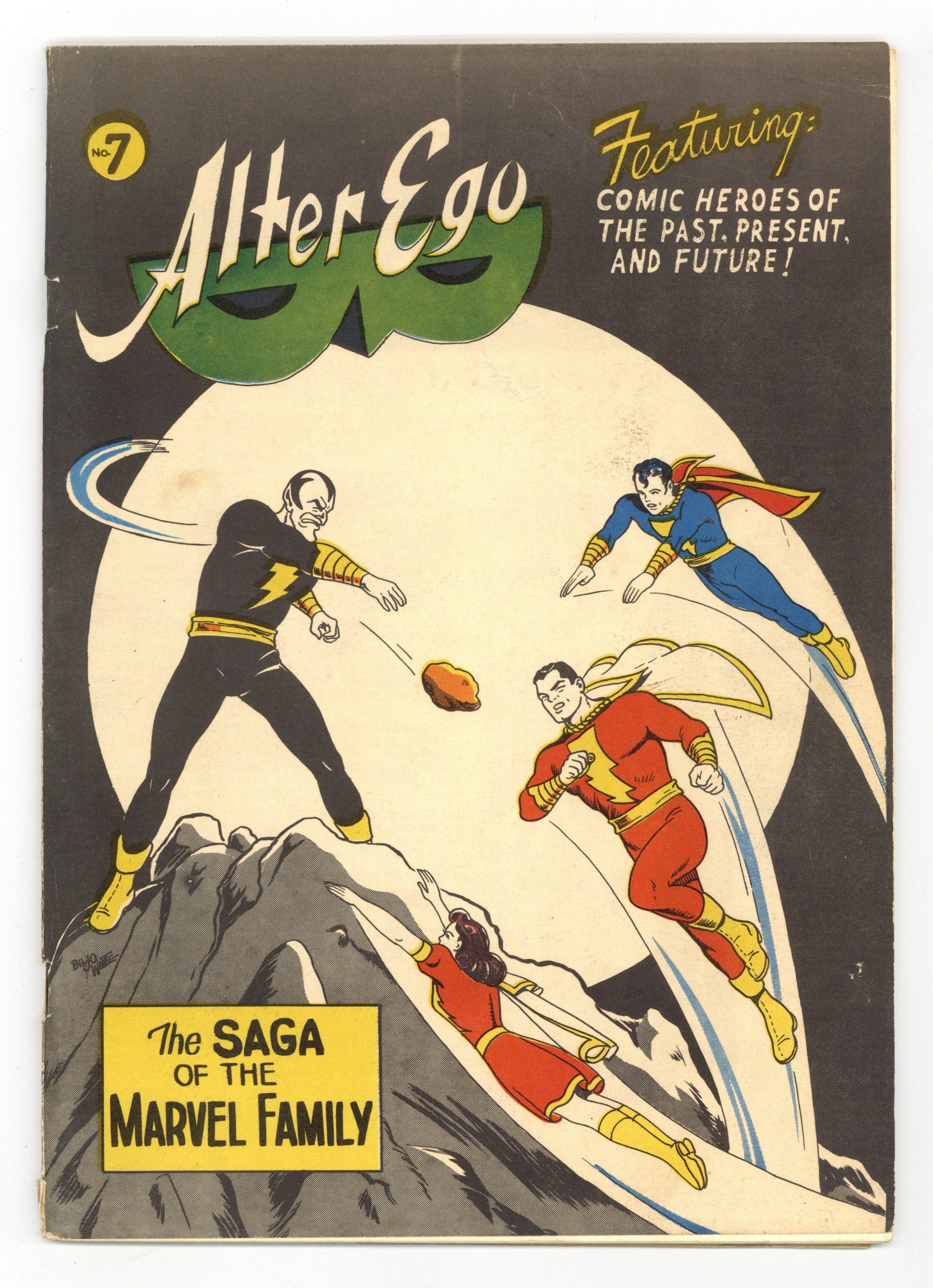 Ends Feb 23 7:09 PM CST Bid History 11 bids Current Bid $61 Your Secret Max Bid If you'd like to bid, please log in or register. Alter Ego was billed as "the world's first comic book fanzine." Issue #7 includes the following: an editorial by Roy Thomas (in which he describes taking over editorship from Ronn Foss); a feature on Solomon Grundy by Richard Kyle (with art "swiped by" Biljo White and Foss); "Alter and Capt. Ego" seven-page strip by Biljo White; a piece on the Golden Age Human Torch by Rick Strong (with art by White); "One Man's Family: The Saga of the Mighty Marvels" by Roy Thomas (with art by White); "Shel Silverfish Looks at the Gilded Age of Comics" by Roy Thomas; a piece on tragic monsters by E. Nelson Bridwell; and letters by Sid Greene, Gardner Fox, Paul Gambaccini, Ronn Foss, and Otto Binder. Marvel Family cover art by Biljo White; back cover art by Ron Foss. Edited by Roy Thomas. 40 pgs. Fall, 1964.