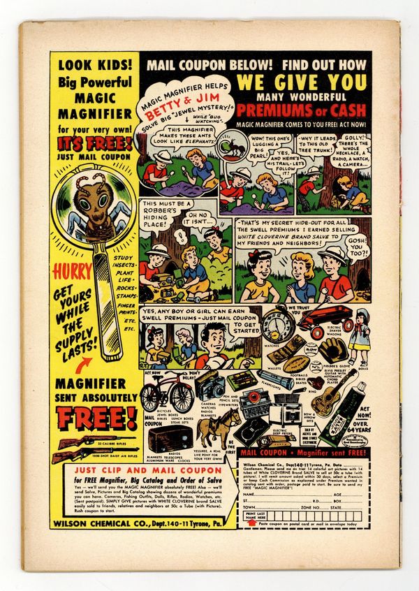 Starts Apr 27 "Red, White and Glue"; Archie tries to give Betty a permanent wave using a bottled solution at home so her hair can be ready in time for their date that night. "Right and Wrong" one-page story starring Suzie. "No Admittance" one-page story; Wilbur argues that the U.S. will never have a female president. "Stranger Danger" one-page story; Archie and Reggie see two guys trying to pick up Betty and Veronica in the park. "Sitting on Top of This Whirl"; Betty tries to earn money babysitting two terrible twin boys so she can afford a new dress. "Stuff about Stars" article; Short anecdotes about Hollywood stars. Betty Fun Page. Archie ad. "Bumper Crop" one-page story; Veronica knocks over a parking meter with her car. "Lip Stuck" one-page story featuring Betty and Veronica. "A Case of Miscasting"; Archie promises the part of Cleopatra to both Betty and Veronica. Archie Annual #5 ad. "Wise Guise"; Reggie suggests that he dress up as Archie and make out with Betty to make Veronica jealous. 36 pgs., full color. Cover price $0.10.