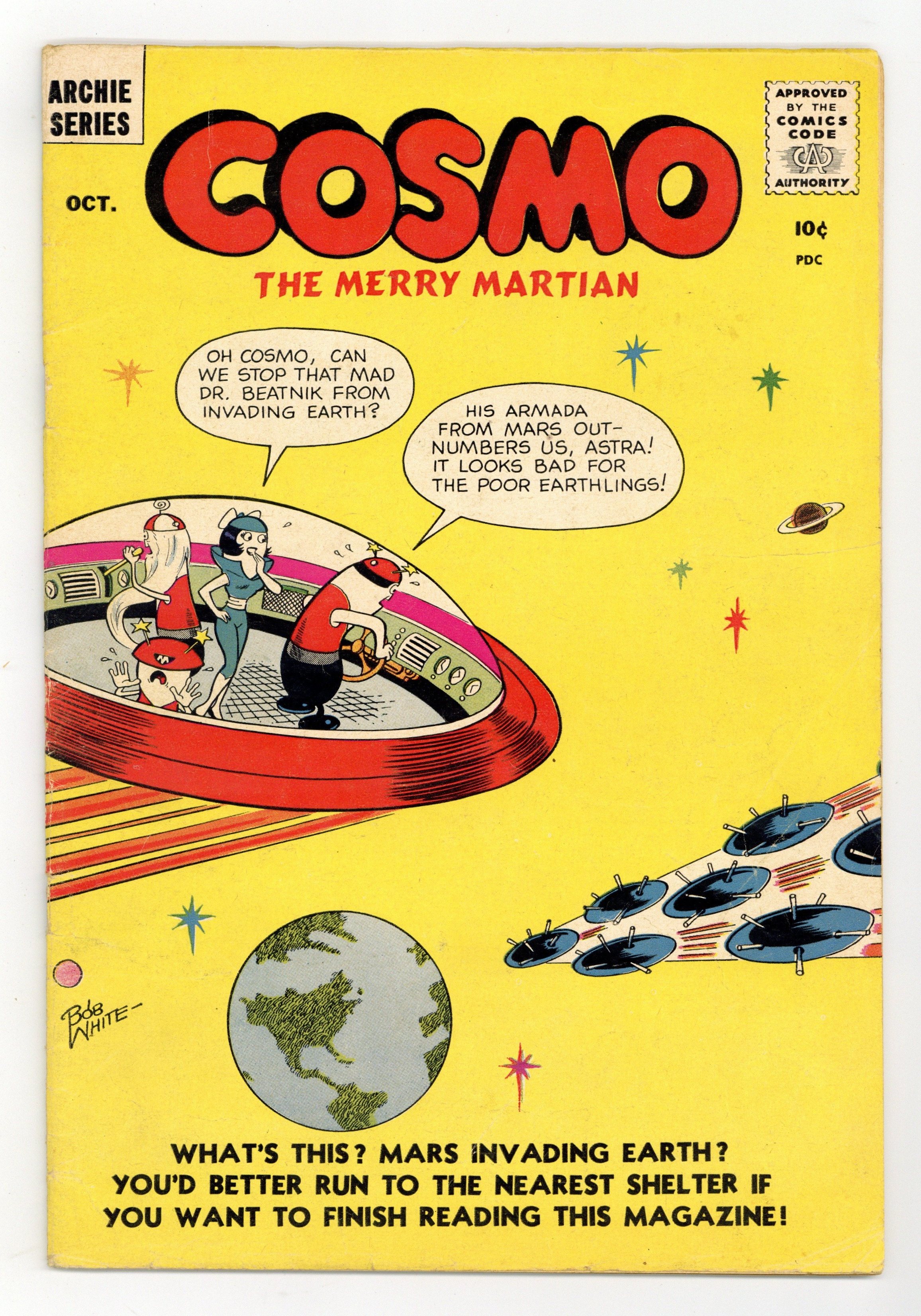 Starts May 4 Cover art by Bob White. Make Mine Mars (Ch. 1), script by Sy Reit, art by Bob White; Cosmo and his friends finally return to Mars, but their quiet time at home is rudely interrupted. Meet Dr. Beatnik (Ch. 2); The source of the violent interruption is mad Martian scientist Dr. Beatnik, who announces that he has assembled a space army to invade Earth, thereby preventing Earth from influencing Martians with their despicable pop culture. The Great Space Chase (Ch. 3); Cosmo and Professor Thmik lead an official Martian expedition to stop Professor Thmik's illegal invasion of Earth. Fire Away! (Ch. 4). The End of Dr. Beatnik, script by Sy Reit, art by Bob White; Professor Thmik uses his own technology to force Dr. Beatnik's army to surrender. 36 pgs. $0.10. Cover price $0.10.