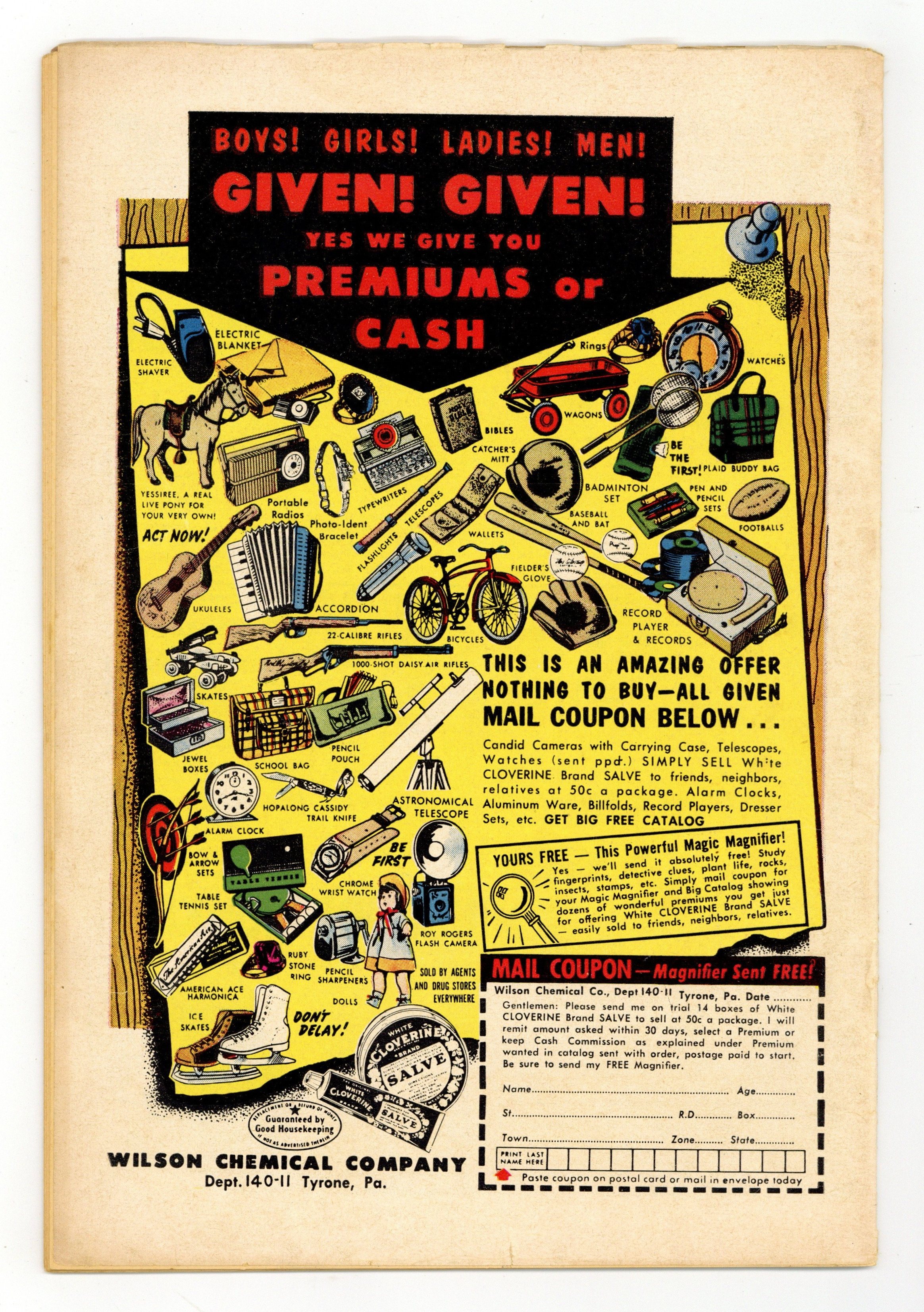 Ends Apr 13 7:20 PM CST Bid History 8 bids Current Bid $47 Your Secret Max Bid If you'd like to bid, please log in or register. Cover pencils by Harry Lucey. "Lead 'em and Weep," pencils by Harry Lucey; When Archie gets a card from a weight and fortune machine that says he's "fearless, determined, strong-willed and a born leader," he gets conceited; Reggie tries to knock him down a peg by bribing a boy to ask Archie to lead his club on a hike in the forest. "Blackboard Blues!"; Miss Grundy can't get her students to pay attention in class; Mr. Weatherbee suggests that the only thing that interests teenagers is television, which gives Miss Grundy an idea to solve the problem. "Well Attired"; While looking for a tire for his car in the city dump, Archie finds a box containing a pearl necklace. Archie Annual ad. "Gone to the Dogs," script by Frank Doyle, art by Samm Schwartz; Reggie gets Jughead in trouble by hiding a rabbit in his desk; Mr. Weatherbee decides to make Reggie "game warden" of the high school to keep students from bringing pets to school and gives him a whistle. Archie Club news. "Hair Pressure"; Veronica sends Archie to pick up a package from René's Beauty Shoppe; When Reggie and Betty see him come out of the shop they razz him and he gets more grief from other students the next day at school. 36 pgs., full color. Cover price $0.10.