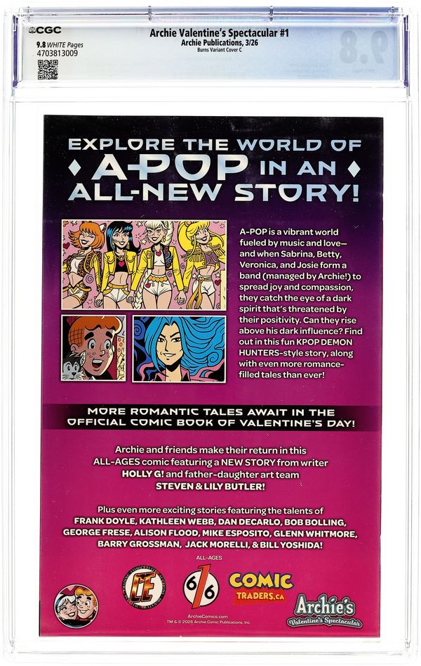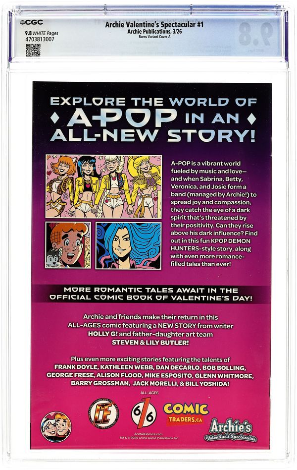 Starts May 18 The 616 Comics, Comic Traders, and Comics Elite Exclusive "Sabrina" Edition Virgin Cover by Josh Burns. Story by Holly G! Art by Steven Butler, Lily Butler, Glenn Whitmore, Jack Morelli. The OFFICIAL COMIC BOOK OF VALENTINES DAY returns with a BRAND NEW STORY! A-POP is a vibrant world fueled by music and love—and when Sabrina, Betty, Veronica, and Josie form a band (managed by Archie!) to spread joy and compassion, they catch the eye of a dark spirit thats threatened by their positivity. Can they rise above his dark influence? Find out in this fun KPOP DEMON HUNTERS-style story, along with even more romance-filled tales than ever! 32 pages, not rated, full color