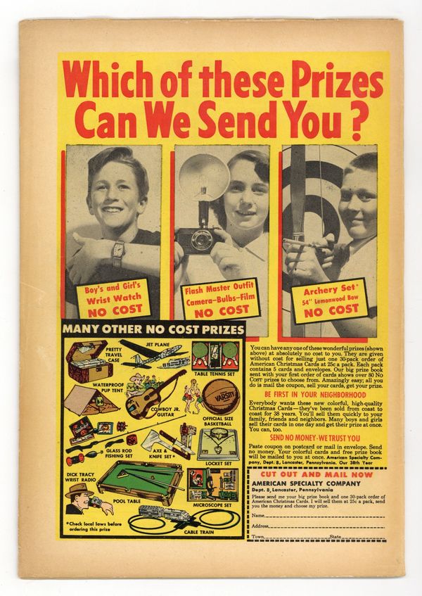 Starts Jan 19 Cover art by Bill Everett. "The Changeling," art by John Forte; The mayor and three children devise a scheme to cheat an old man out of his property. "The Secret of the Graveyard!", art by Herb Familton; Two hunters find out that the elephant's graveyard is a cave with a quicksand floor. "Pouf!" text story. "The Blank!", art by Angelo Torres; A man from the future comes back in time to prevent a scientist from conducting an experiment that will have the unforeseen consequence of sterilizing the soil. "What the Mirror Revealed!", script by Carl Wessler, pencils by Bob Forgione, inks by Jack Abel; A man invents a time mirror to display the past events of the person who looks into it; He pretends to be selfish so that a girl who is infatuated with him will profess her love to the self-sacrificing, but poor man he has challenged to look into the mirror. "They Can't Resist!", art by Manny Stallman; An alien from Ganymede gives a disk to a man hoping his curiosity will cause him to trigger a release of gas from the disk when he looks at it which will allow the aliens to invade easily, but the man tosses the disk into the river as he is blind. "Fear Follows Fenton," script by Carl Wessler, art by Mac Pakula; When a detective falls into a coma, the fugitive that he has been assigned to apprehend finds that he cannot elude the man; The police chief is happy when the fugitive is delivered over to him and then shocked to find the detective just recovering from his coma. 36 pages, full color. Cover price $0.10.