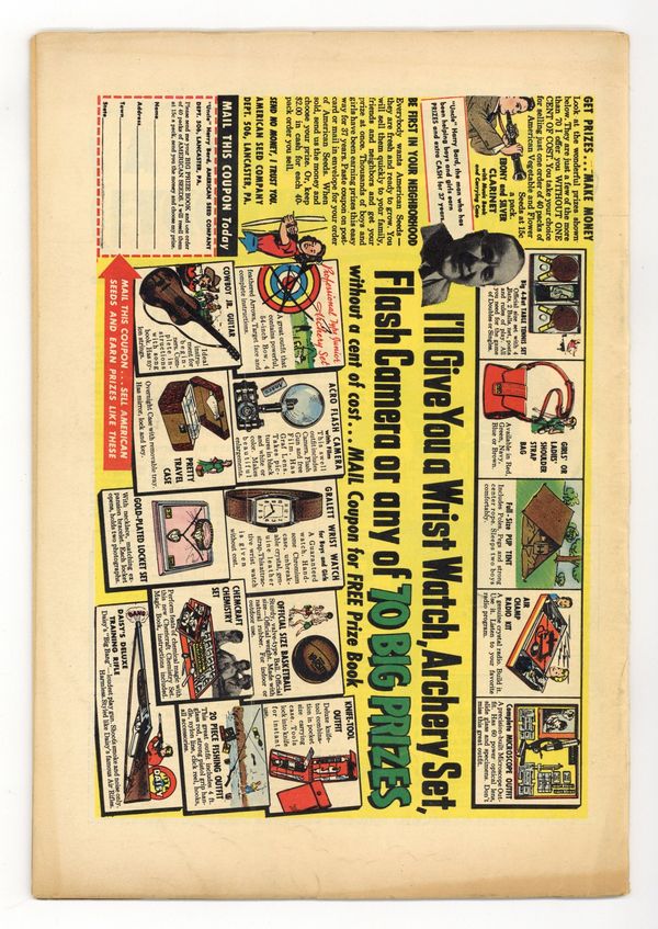 Starts Jan 19 Cover art by Fred Kida. "The Eighth Wonder of the World," art by Richard Doxsee; Four conmen come up with an idea to dig up a giant that they plant in the earth and exhibit it to make money but they disturb a real giant with their scheme. "Only One Returned," art by John Forte; Two men descend into a cave shaft and one plots to dispose of the other so that he can marry his girlfriend; He cuts the rope and the other man falls into the river. "The Swami's Secret," art by Bob Bean; A mind-reading swami is undone when he comes across an individual he believes is an alien preparing to invade; He signs a confession to the police that he has been swindling wealthy clients for years but thinks the occasion is important enough to reveal his secret ability. "The Second-Hand Man!", art by Ed Winiarski; When a law-abiding man buys a used car that had belonged to an executed gangster, he finds himself behaving in reckless and aggressive ways. "The Missing Tooth" text story. "The Missing Sun," script by Carl Wessler, art by Matt Fox; A giant insect blots out Earth's sun and even more giant creatures save Earth by getting the insect to leave. "Bewitched!", art by Bob Powell; The book of Genda, a yogi fanatic, holds a town paralyzed until a man's glasses slip off his face and light magnified through one of the lenses burns up the pages. 36 pgs., full color. Cover price $0.10.