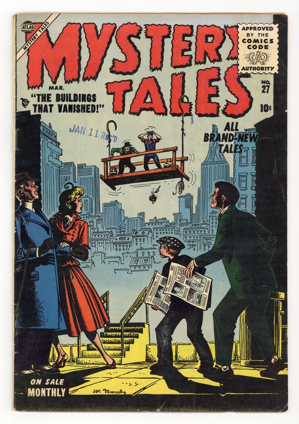 Starts Jan 19 "The Buildings That Vanished" (art by Dick Ayers), "Feet of Clay," "Costume Party," "Lonely Hearts" (art by John Forte), "Welcome Home" (art by Al Hartley), and a two-page text story, "The Letter." Joe Maneely cover. Cover price $0.10.