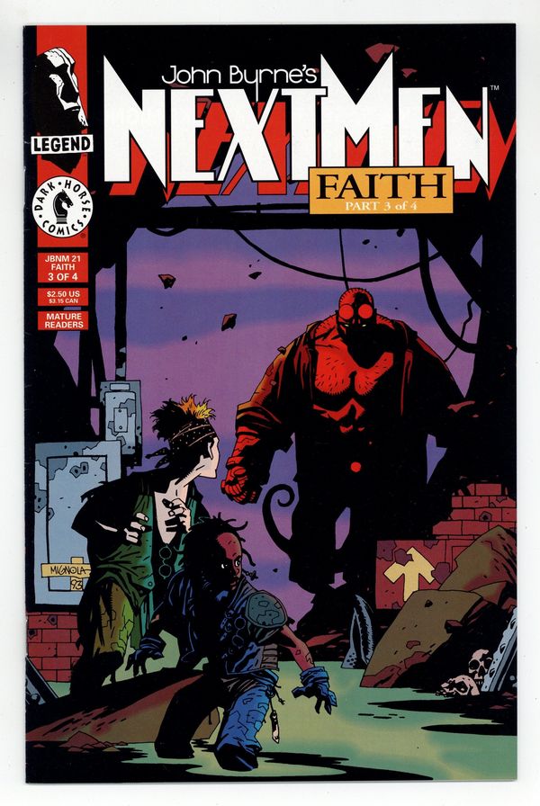 Starts Dec 8 NOTE: 1st appearance of Mike Mignola's Hellboy (1st full app. in comic books) - Faith: Part 3 of 4 - Story and art by John Byrne. Cover by Mike Mignola. Guest-starring Hellboy. When Legends clash! (Or crossover!) Presenting the first "official crossover" within the Legend line -- the Next Men meet Mike Mignola's HELLBOY! Danny is actually the lucky one to have his path cross that of the World's Greatest Paranormal Investigator, in a segment drawn by guest Legend star Mike Mignola. Meanwhile, we present the life of Christ as seen through the eyes of Jack, whose imagination infuses the well-known story with some familiar faces. In the ongoing saga of Mark, a.k.a. MIV, we find out just what he's been doing during the missing seven years of his life. 36 pages, full color. Cover price $2.50.