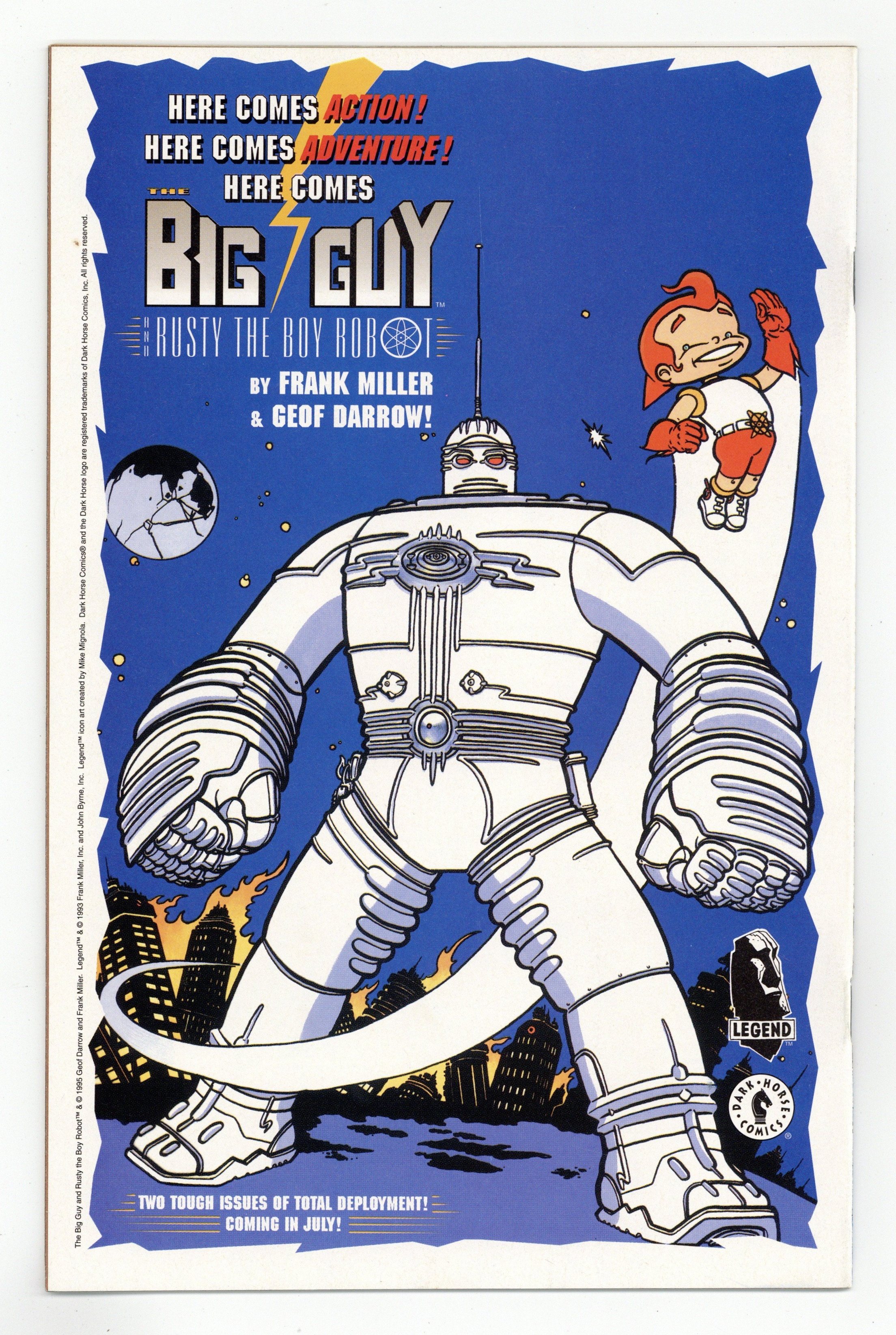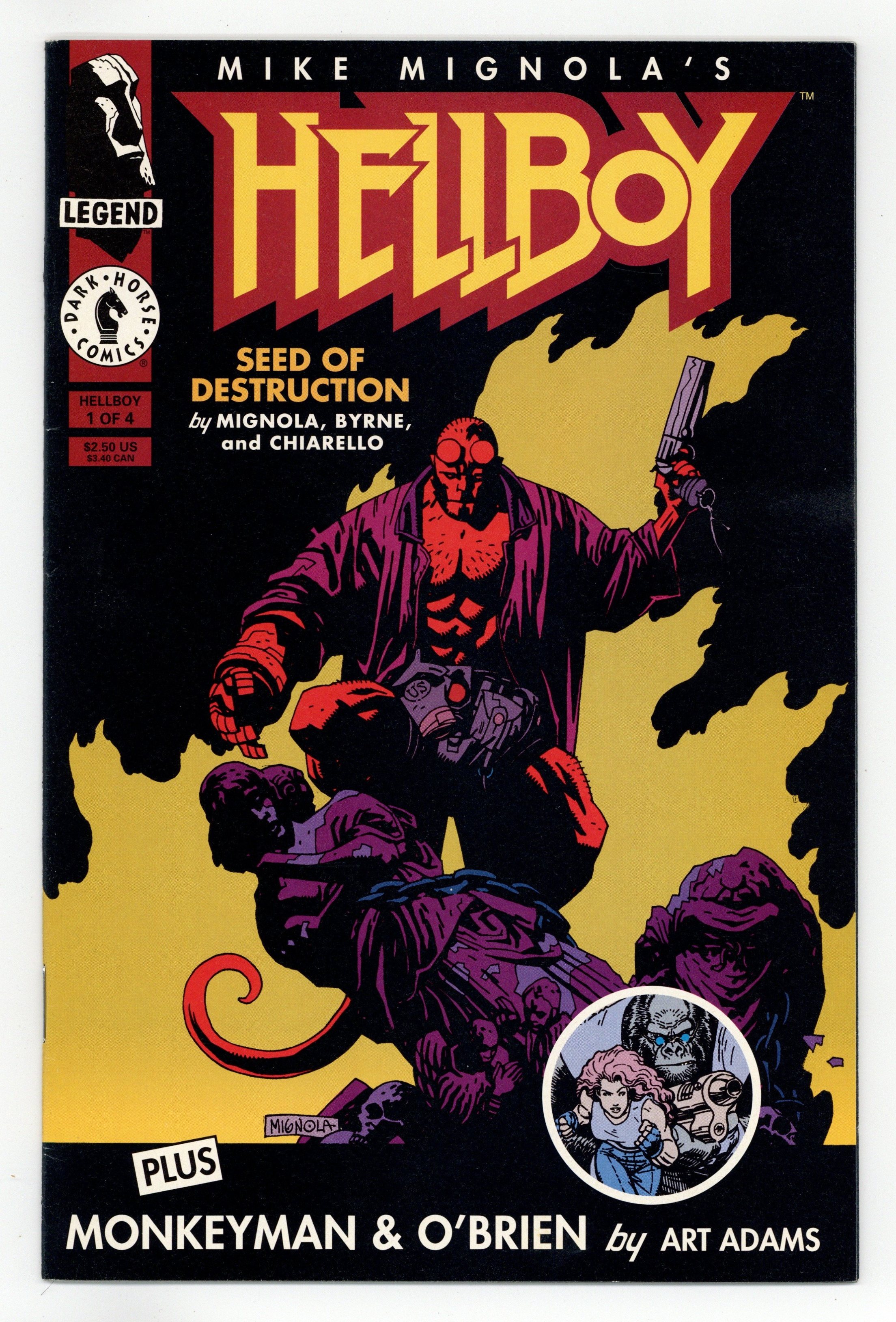 Starts Dec 15 Written by Mike Mignola and John Byrne. Art by Mike Mignola. Hellboy bursts onto the film noir monster detective scene. From his apocalyptic origin in WWII England to the modern-day case of the sole survivor of a doomed Arctic expedition, Hellboy must battle vampire frog creatures and worse in his debut miniseries. Created by Mike Mignola, with script by John Byrne, and colors by Mark Chiarello. Hellboy -- World's Greatest Paranormal Investigator. Also featuring chapter one in the astounding origin of Monkeyman and O'Brien, the most dynamic duo since a talking scientific genius (who also happens to be an ape) and a beautiful, super-strong blonde (who also happens to be a scientist) teamed up to battle extra-dimensional menaces while looking for a way to return Monkeyman to his home dimension! Story and art by Arthur Adams. 32 pages, FC. Cover price $2.50.