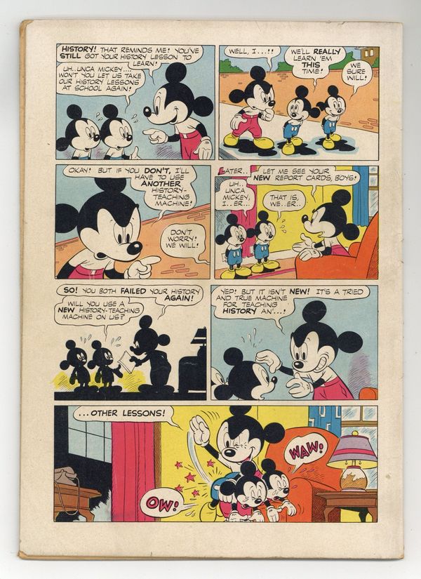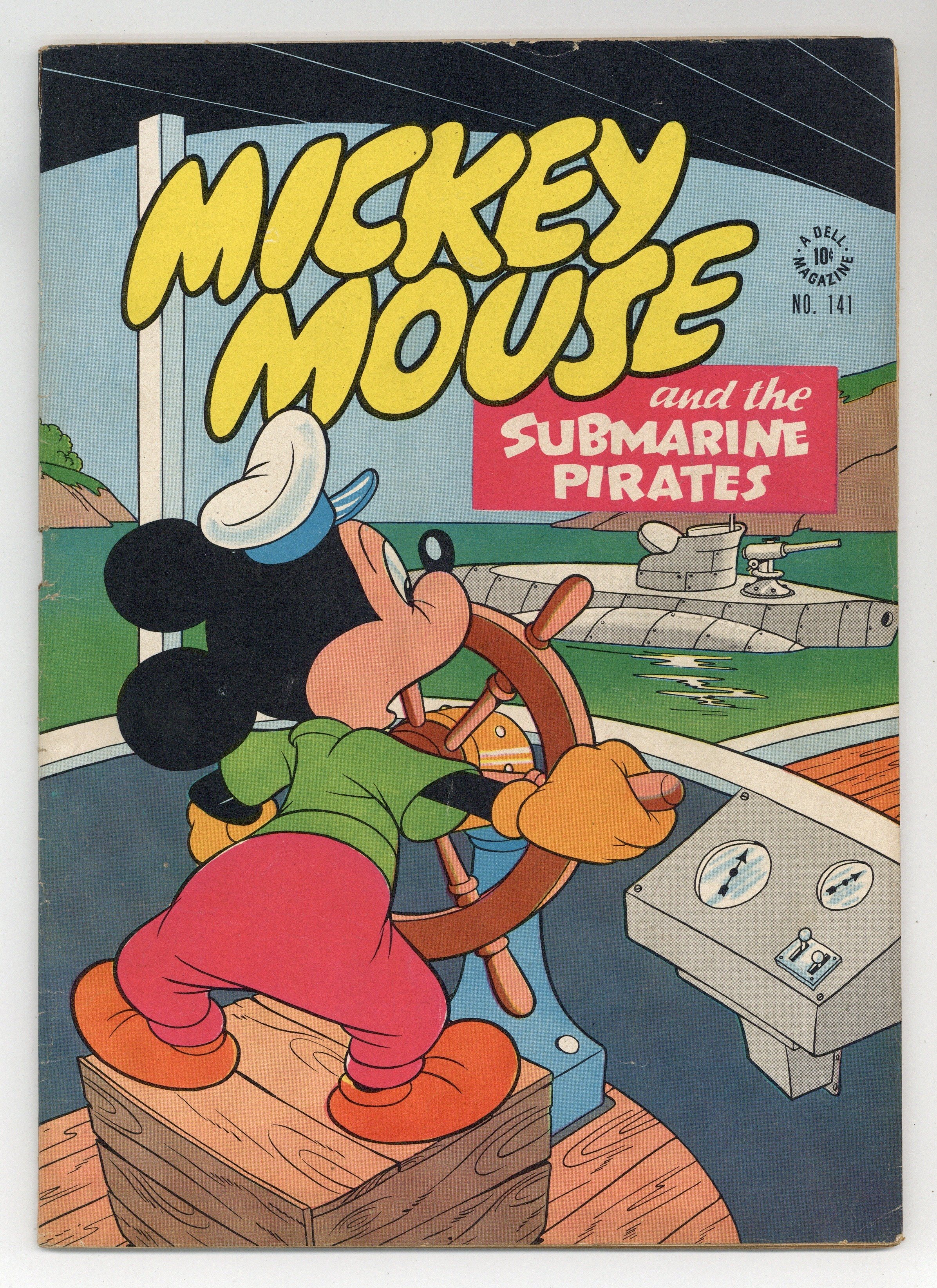 Starts May 4 Indicia title is "MICKEY MOUSE AND THE SUBMARINE PIRATES, No. 141." Cover art by Harvey Eisenberg. Mickey Mouse and the Submarine Pirates, art by Harvey Eisenberg; Mickey and Goofy take a job on a fishing boat, despite the fact that fishermen have been disappearing. Pluto Never Fails, art by Harvey Eisenberg; While out on a picnic with Minnie, Mickey demonstrates his system of getting Pluto to fetch the proper item for him. Mickey Mouse's Magic Machine, art by Dick Moores; When his nephews fail their history class, Mickey decides to try to teach them with pictures. 52 pages, full color. Cover price $0.10.