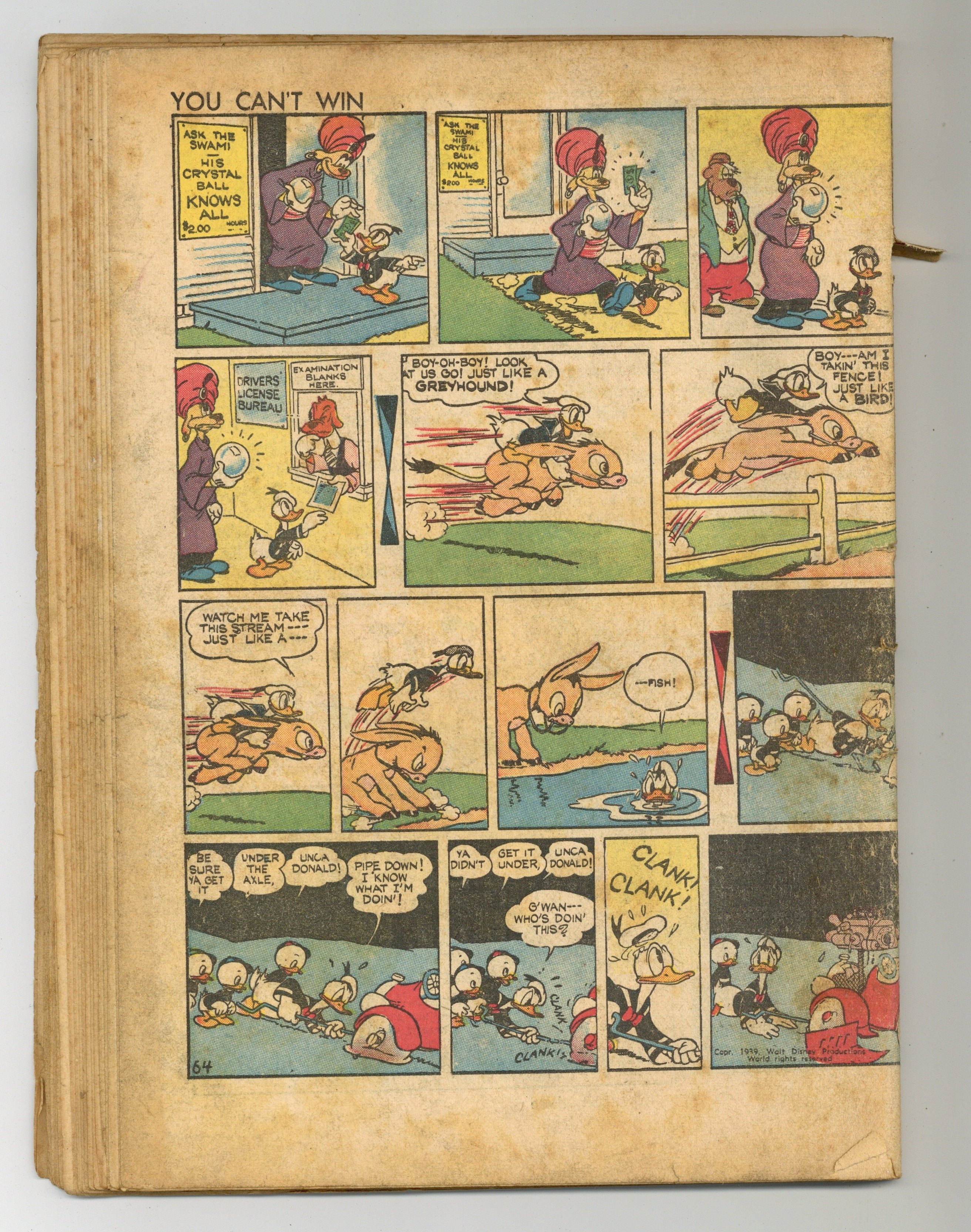 Starts Apr 20 Stories and art by Walt Kelly, Carl Barks, Floyd Gottfredson, Merrill De Maris, Bob Karp, Manuel Gonzales, Sylvia Holland, Bob Wright, Bob Grant, and Al Taliaferro. Sometimes listed as Vol. 3 #12. The long-running vehicle for Disney character comics featured early work by Carl Barks, the legendary Good Duck Artist. In a classic Floyd Gottfredson story from the Mickey Mouse comic strip, Mickey competes with Montmorency for Minnie's affections. In a story by Barks, Donald and his nephews compete to build the best animal traps, first for foxes, then wolves. In a story by Kelly, Gremlin Gus and the Widgets choose the wrong place to light a match. Plus a vintage ad for Disney's WWII propaganda film, Victory Through Air Power. The Mighty Trapper; Cousin Bertie; Financially Embarrassed; Carnival Fun; Contrary Condors; Weighty Wishes; Magic Stream; Alone at Last; The Gremlins; Mickey Mouse: Love Trouble; Hollywood Chatter; Tight Fit; Only His Hands Got Hot; Gentleman in Waiting; And Besides She's Left Handed; Two Strikes Is Out!; Faith, It's Wonderful; Bumpsy Daisy; Night Prowlers; It's Smart To Be Thrifty; #17 In The Ration Book; Strictly Legal; Donald Gets Stuck; He Was Warm; It's An Ill Wind; Empty Saddle; Time's Up!; The Retriever; Back to School; A Woman's Wiles; Plane Paper; On the Spot; Baby Needs New Shoes; Within the Law; Double Features; His Good Deed for the Day; A Hard Woman; Primer Page. 64 pages, Full Color. Cover price $0.10.