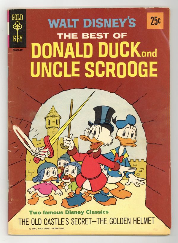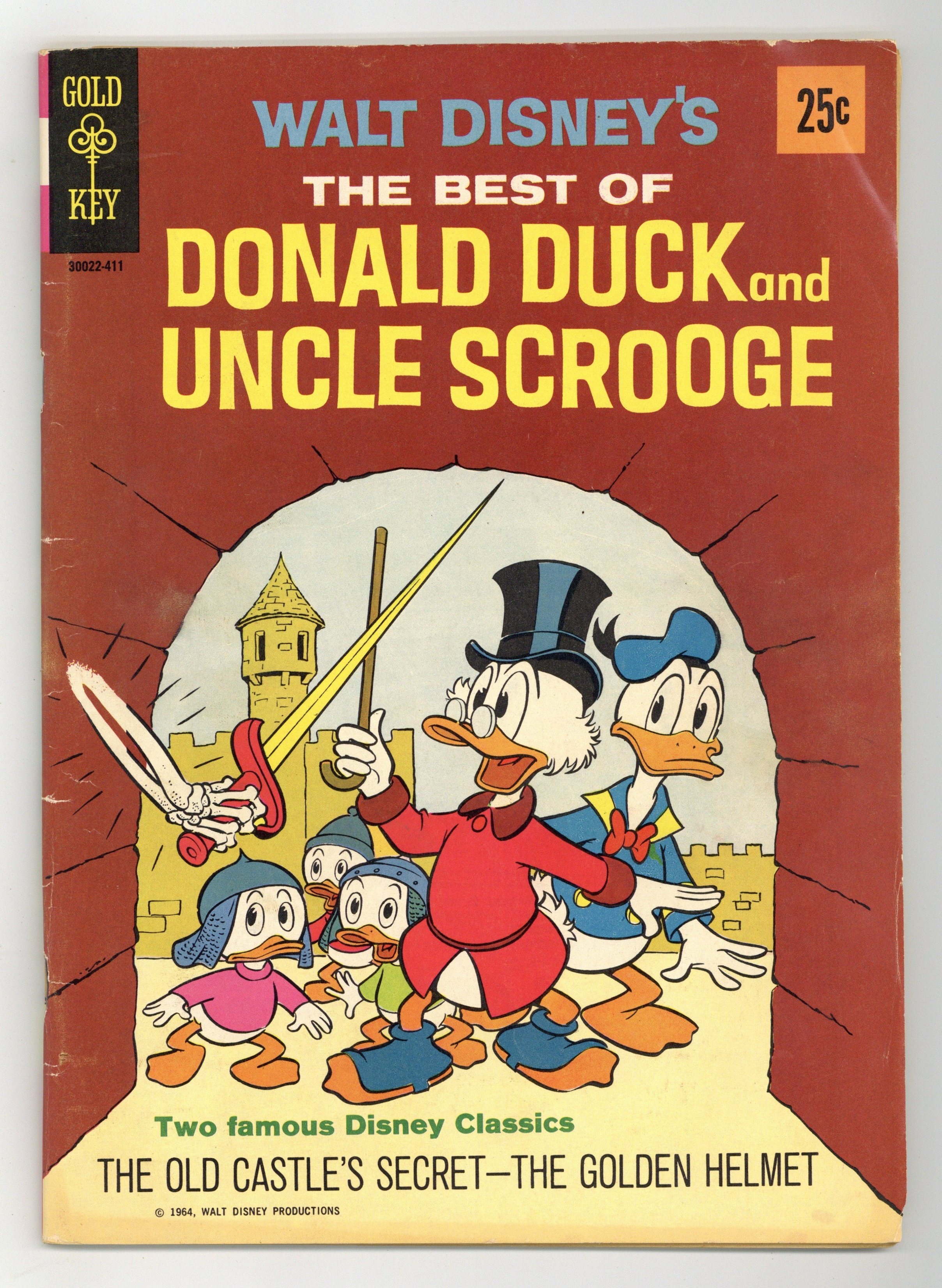 Starts Dec 22 THE BEST OF DONALD DUCK AND UNCLE SCROOGE (GOLD KEY) #1 1964 25c Giant size comic reprinting two classic Duck stories by Carl Barks: "The Old Castle's Secret" in which Donald, Scrooge, Huey, Dewey, and Louie search for an ancient treasure in the ancestral home of clan McDuck, an old castle in Scotland and "The Golden Helmet" in which Donald and Huey, Dewey, and Louie journey far away to find the legendary golden helmet, the bearer of which will own North America. One page gag-strips on inside covers. Front cover features the "The Old Castle's Secret" and the back cover features "The Golden Helmet." Cover price $0.25.