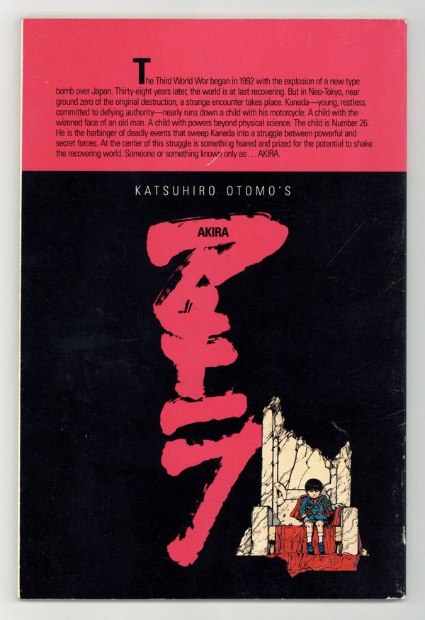 Ends Apr 16 7:15 PM CST Bid History 12 bids Current Bid $201 Your Secret Max Bid If you'd like to bid, please log in or register. 1st printing. Here it is – the first English translation of Katsuhiro Otomo's influential manga series, paving the way for the manga and anime craze to blossom in the English-speaking world. Decades after a mysterious explosion destroys Tokyo, teen bikers Tetsuo and Kaneda encounter a child with the face of an old man; his strange powers hold the key to the mystery. Story, art and cover by Otomo. Color by Steve Oliff, who pioneered the use of computer coloring with this series. Also includes an introductory article by Archie Goodwin. Mature readers. Cover price $3.50.